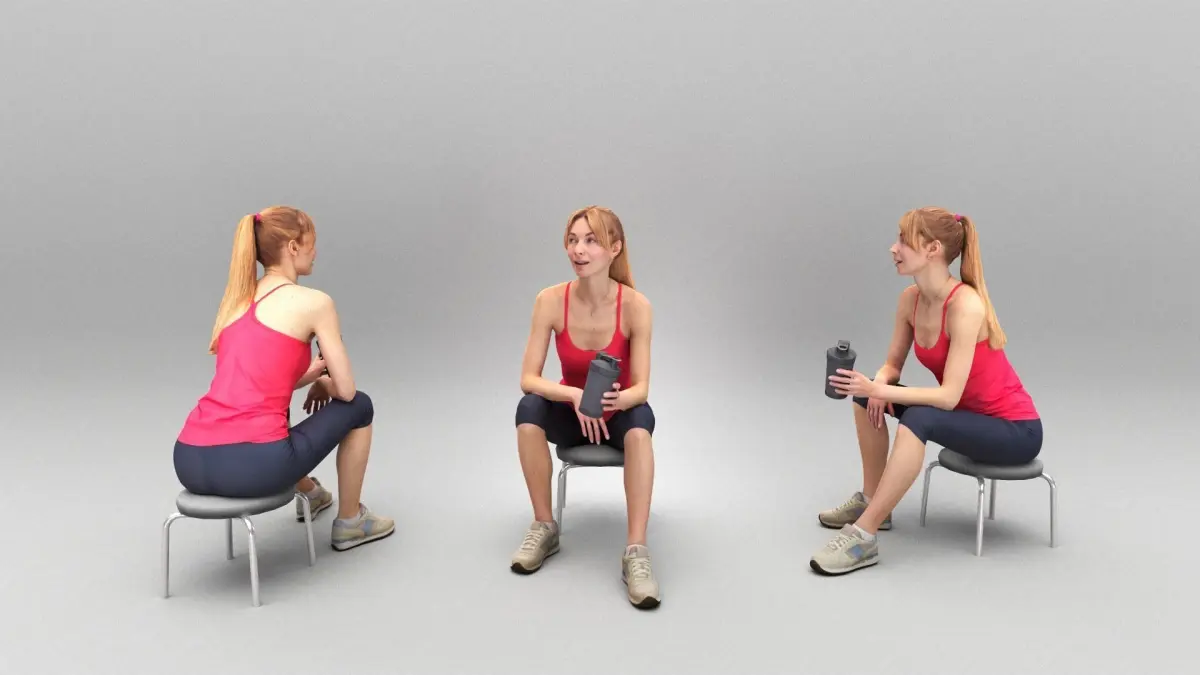 This is a true human-sized and detailed model of a sporty beautiful woman of Caucasian appearance dressed in sportswear. The model is captured in a casual pose to perfectly match various architectural and product visualizations, as a background or mid-sized character on a sports ground, locker room, gym, beach, park, VR/AR content, etc.