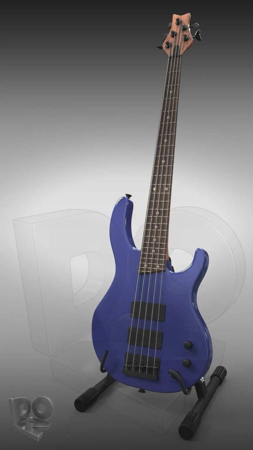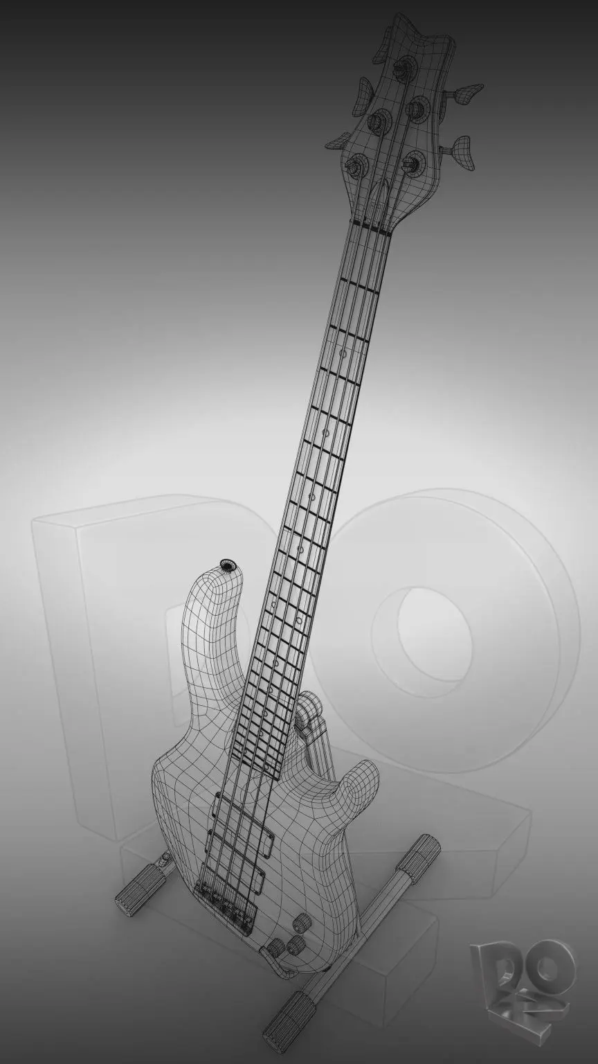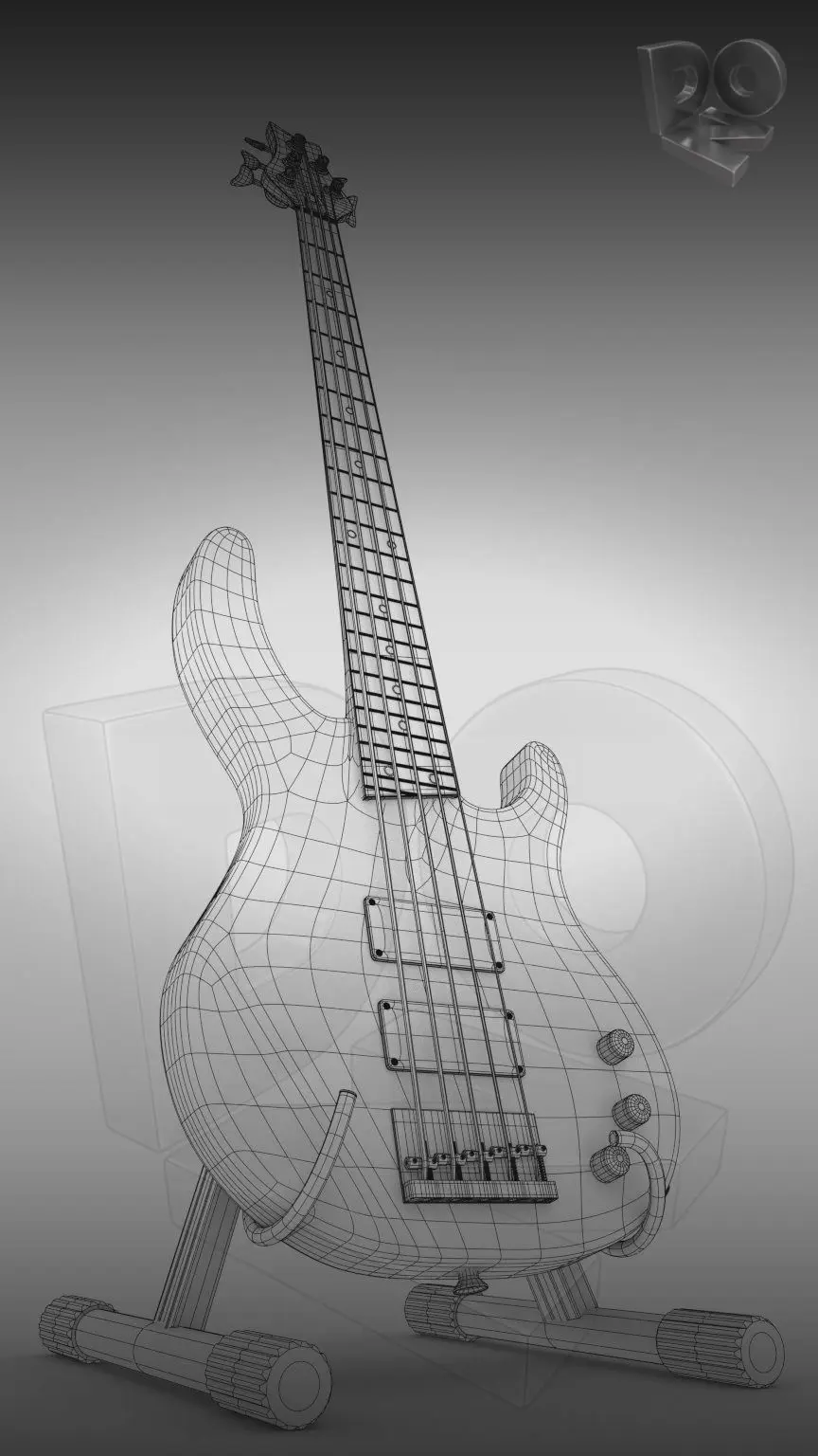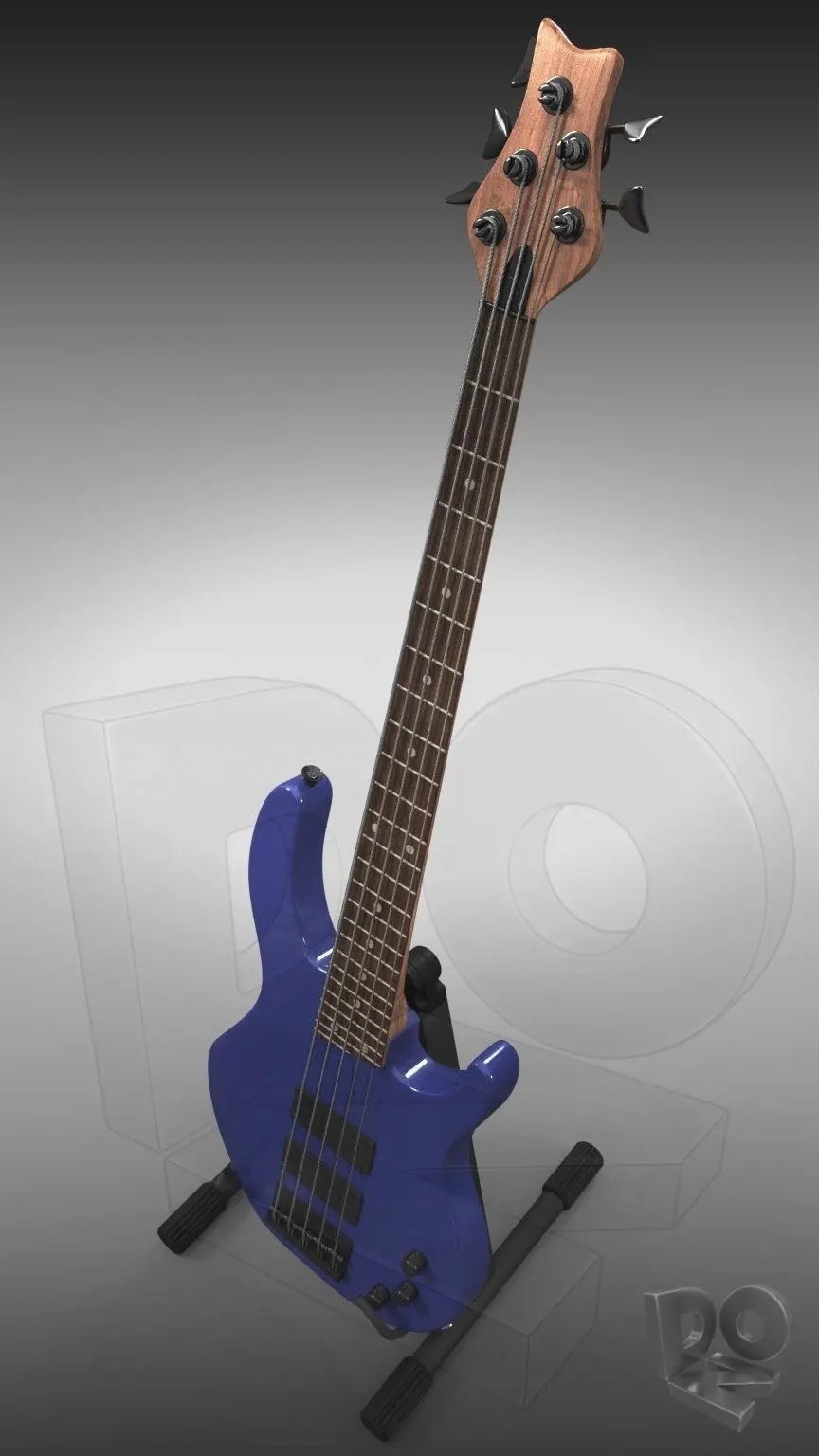 Detailed, optimized, subdivision-surface-ready 3d model of a common five string electric bass guitar plus stand.