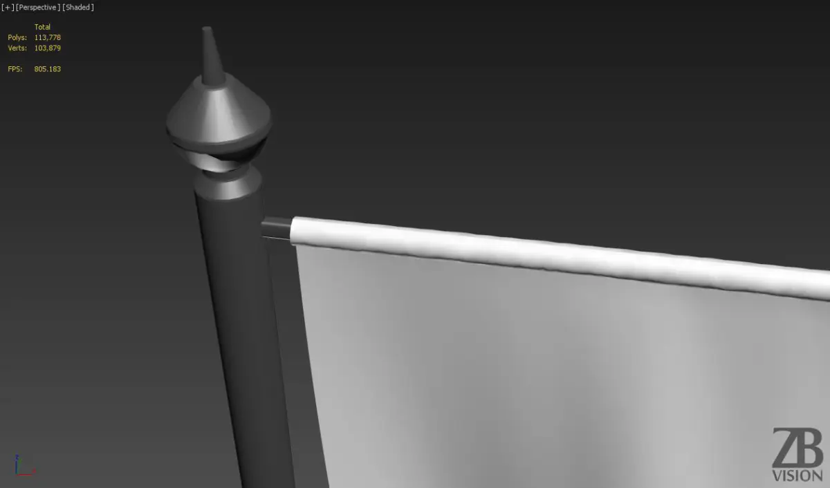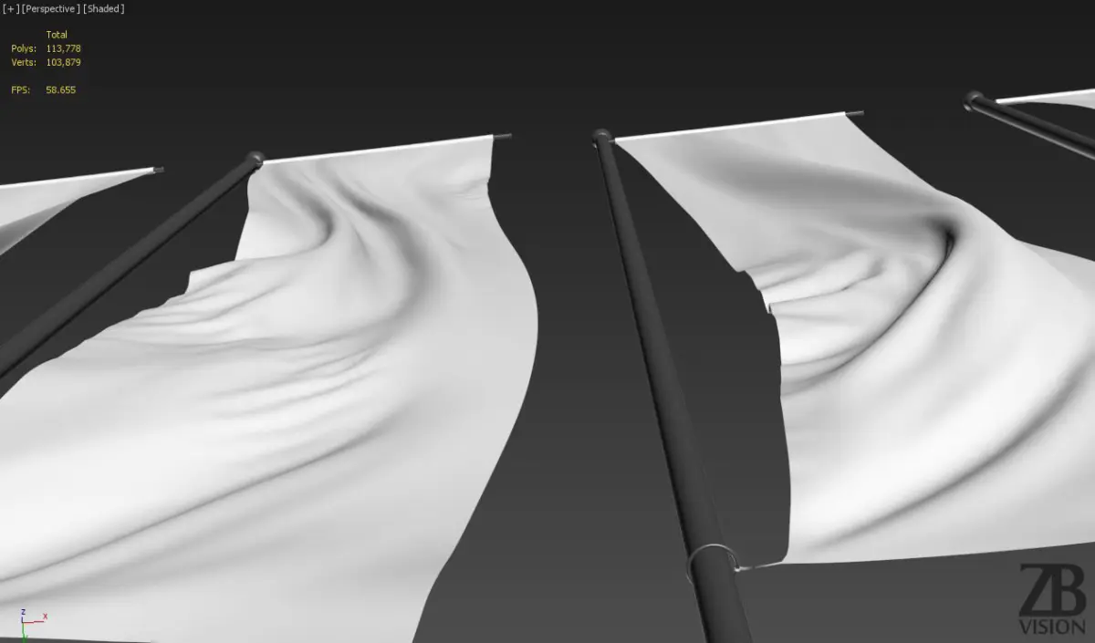 The flag model is presented as single mesh. There are 5 versions of mesh for this flag. The flags are mostly quad based. The polycount per flag is around 22K. Flags are single objects with the pivot point at the base of the pole.