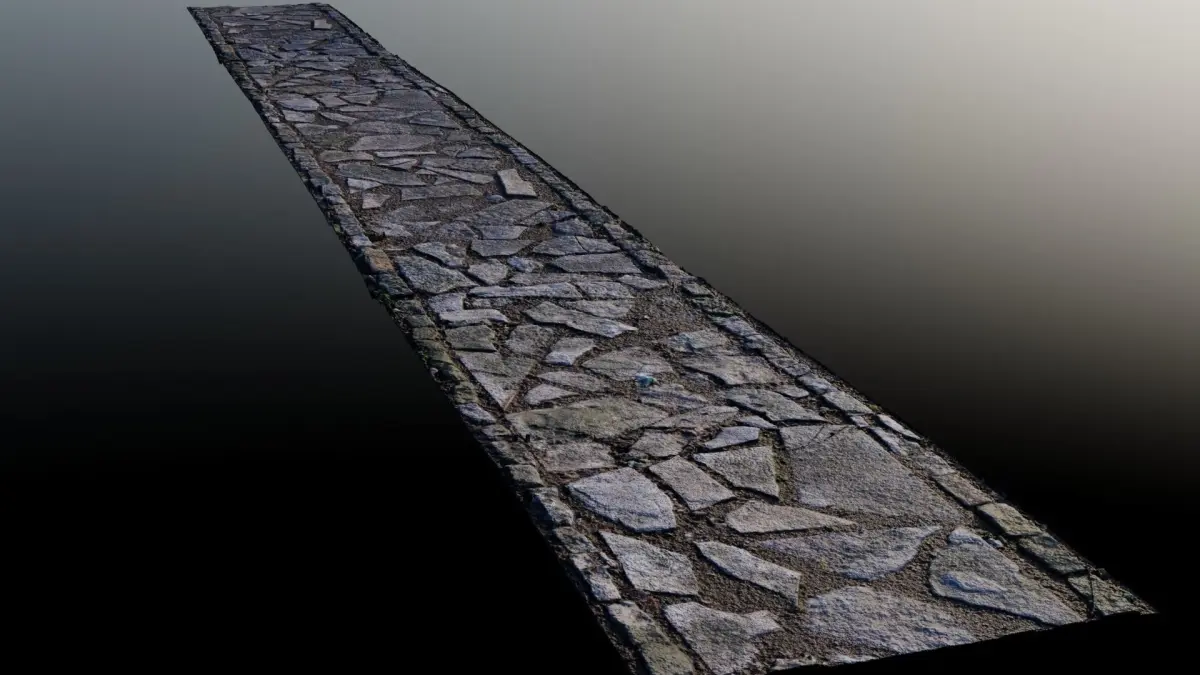 A material derived from a photo-scanned flagstone footpath, processed to tile seamlessly into itself. The texture set is 9k by 1.8k and consists of an Albedo map, a Normal map, and a 16 bit height/displacement map. Footpath can be arrayed and bent along a curve to suit the artist's needs. Simple grass particle set is included with this package.