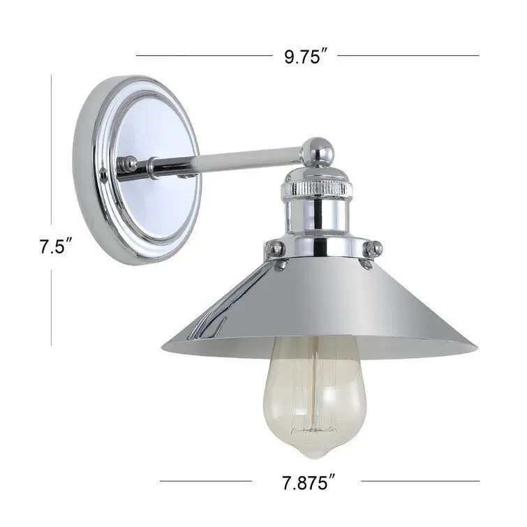 - This dynamic design features a metal cone shade that conceals the top half of the bulb perfect for a polished industrial look. In a shiny chrome finish, this sconce is perfectly at home on either side of a bathroom mirror or as extra lighting in kitchens, where your hardware truly shines.