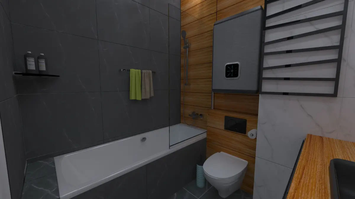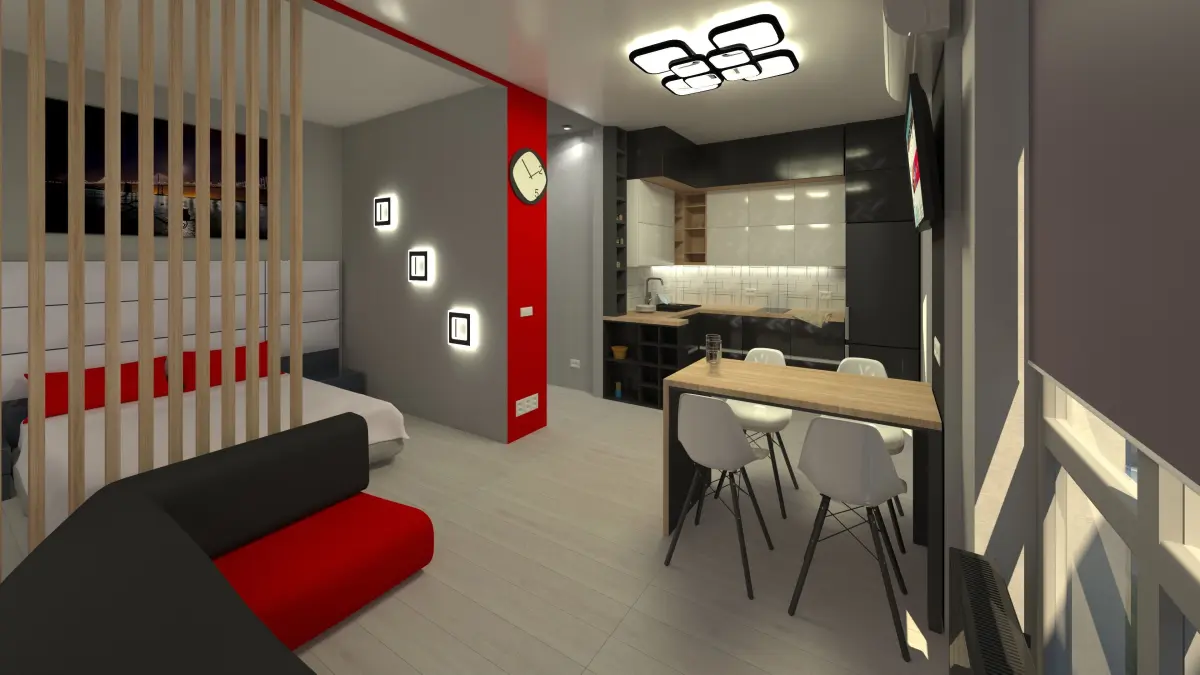 Interior design of small flat. All textures in the archive. 1 bedroom, 1 room-kitchen (studio), corridor and bathroom. There are TV, tables, air condition, bed, sofa etc. Made in 3ds Max 2020. If you need any other version, contact me: inst @yura.kharabara