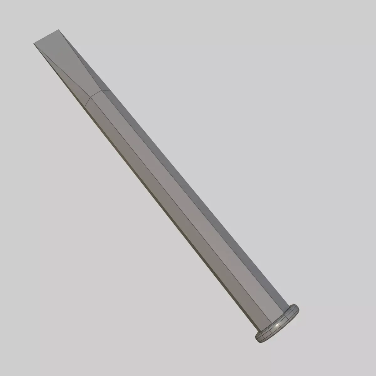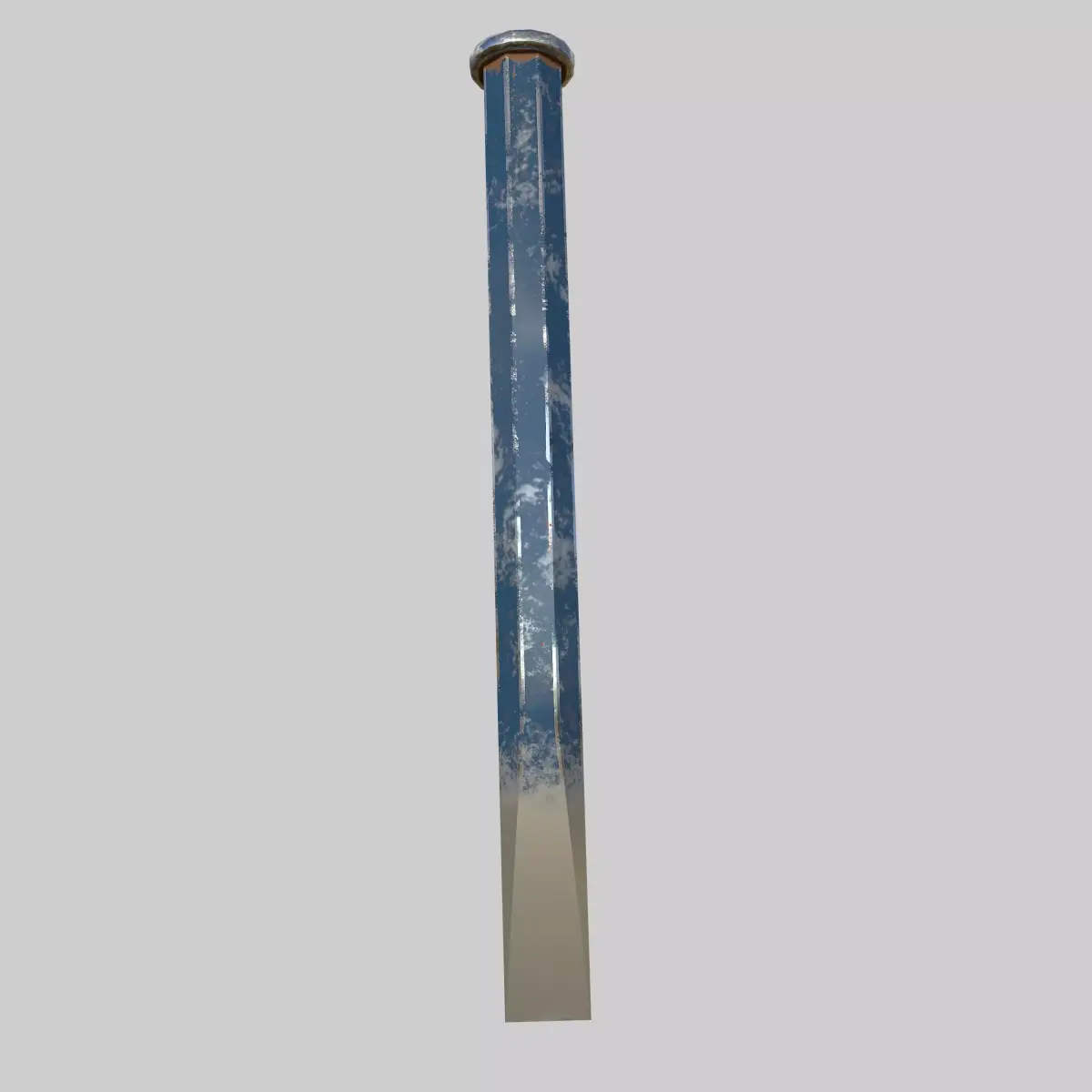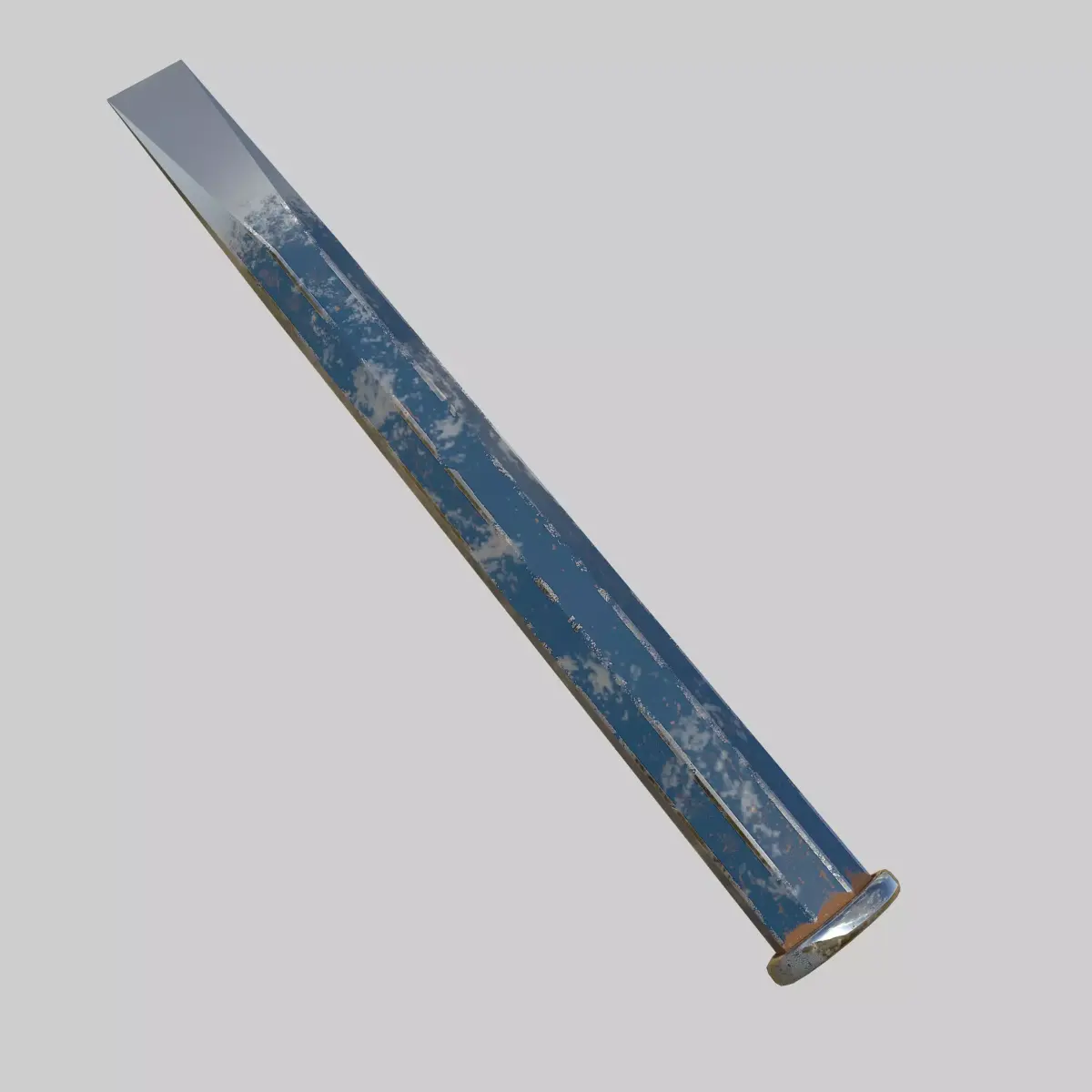 This model accurately represents a hardened flat chisel used for cutting or shaping metal, concrete, or masonry. It features a beveled cutting edge, forged steel body, and a striking head with natural wear patterns.