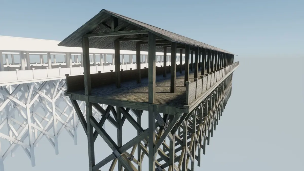 This is an old-fashioned flat, wooden bridge that measures 175 feet long and 24 feet wide. The measurement between the floor to the bottom of the supports is 30 feet.