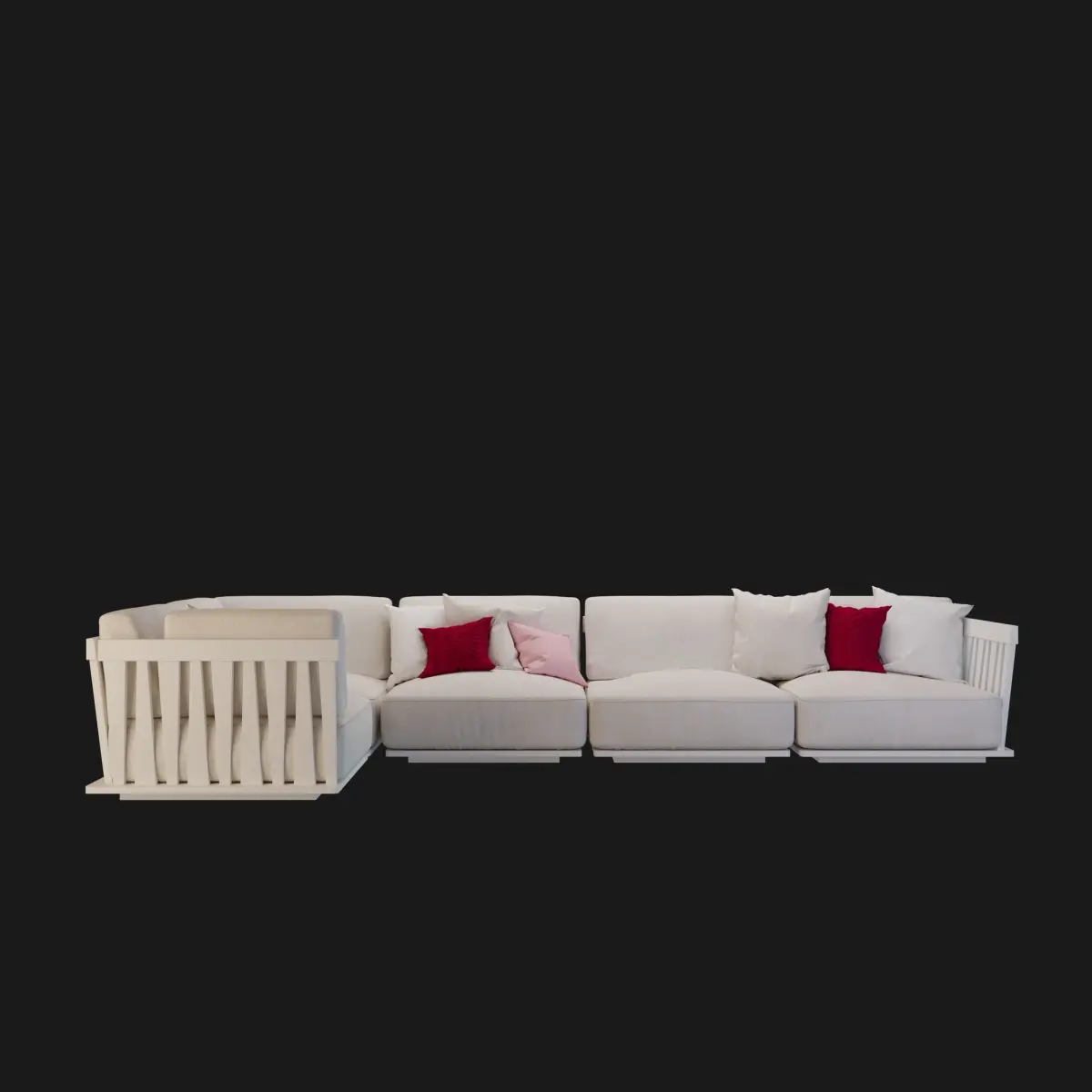 The base of the Zante sofa is made entirely of Okoume marine plywood, perforated to allow better aeration of the cushions. The upper part is in iroko veneer, to match the structure of the backrest and armrests, which are made entirely of solid iroko, with a unique design of hand-fitted interlocking strips of irregularly shaped wood. The sofa sits on a perimeter frame in austenitic stainless steel 316 which is lifted off the floor by nylon pads.