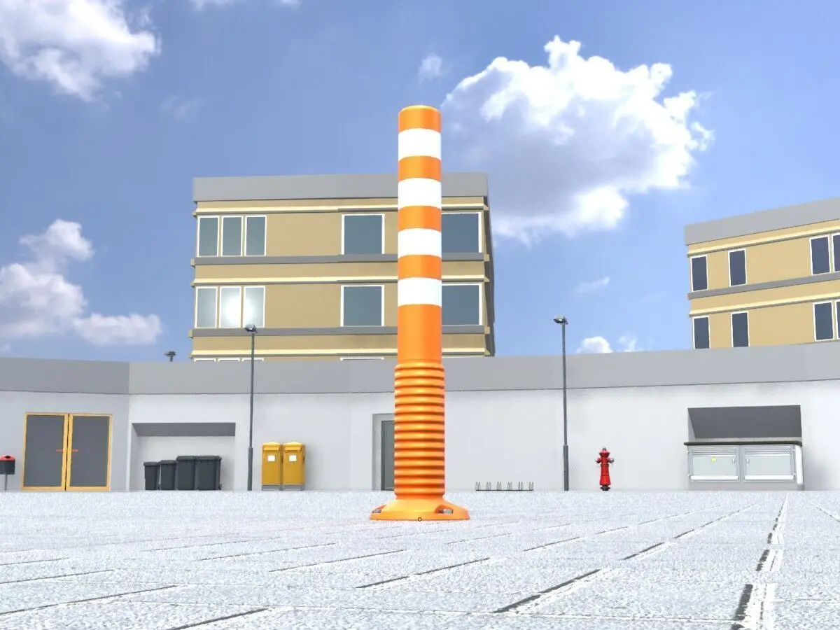 - Here you can see a 3D model of an orange flexible bollard with white reflective strips for use in road traffic.