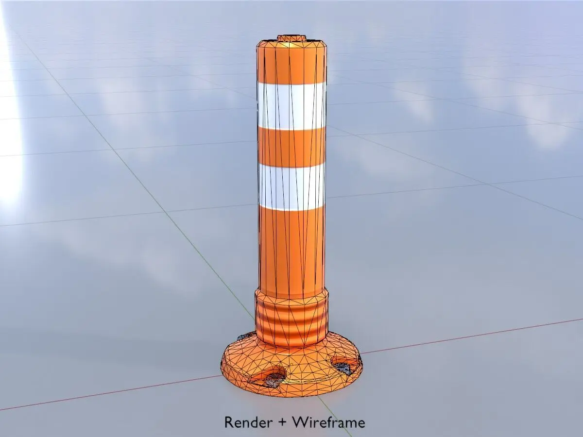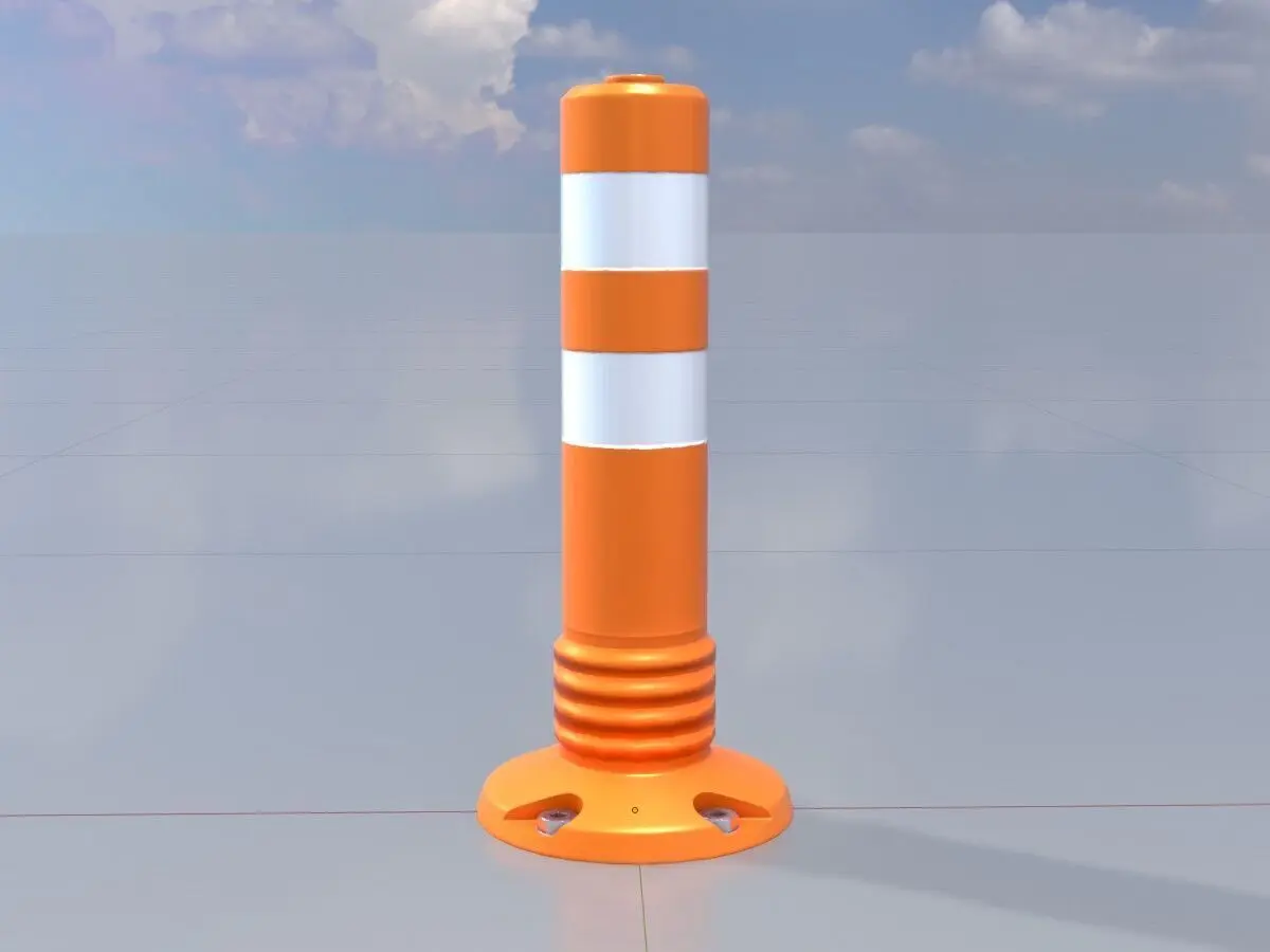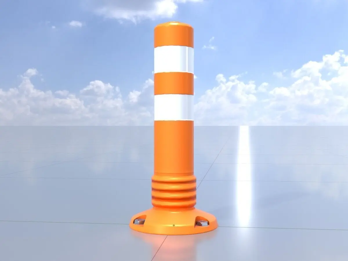 - Here you can see a 3D model of an orange flexible bollard with white reflective strips for use in road traffic.