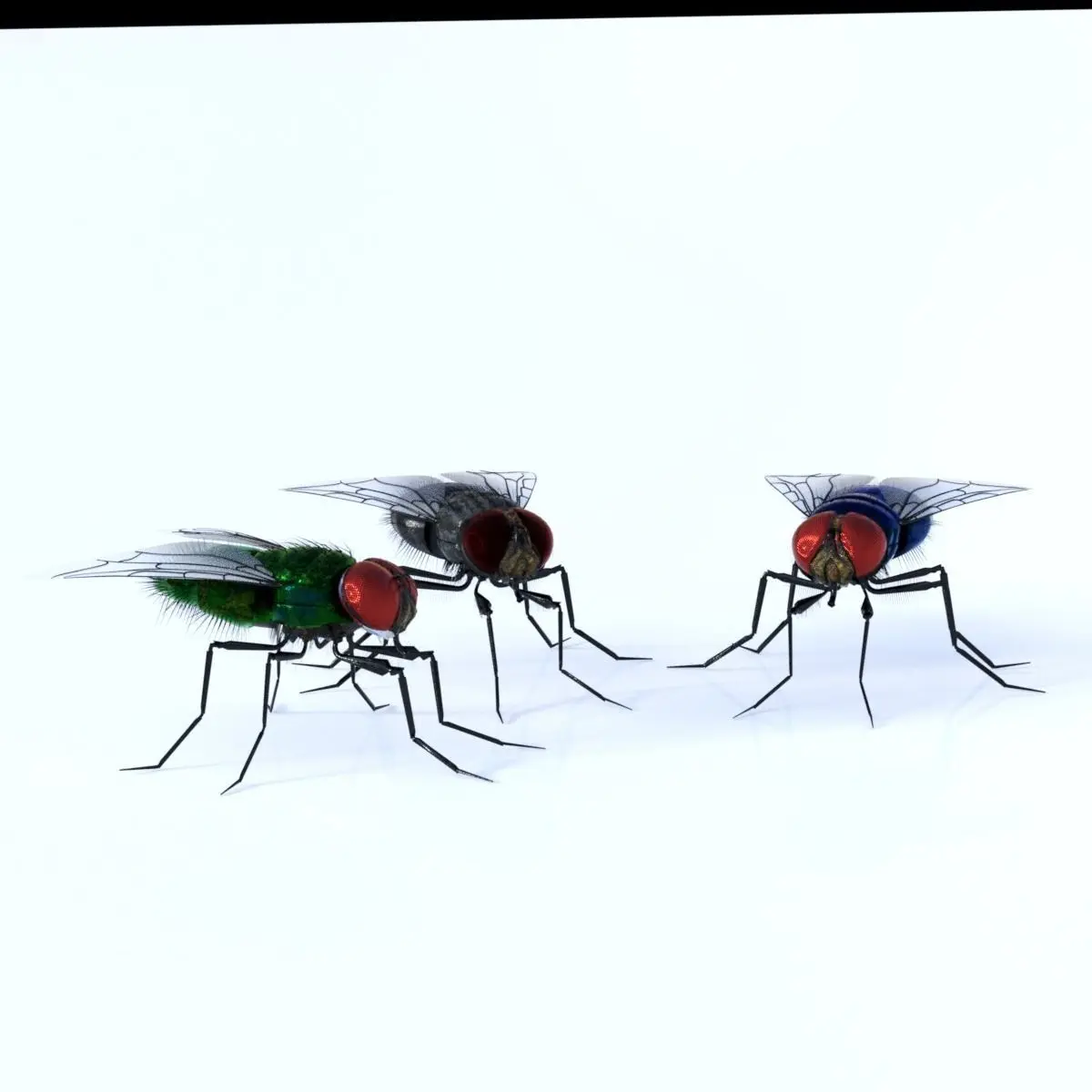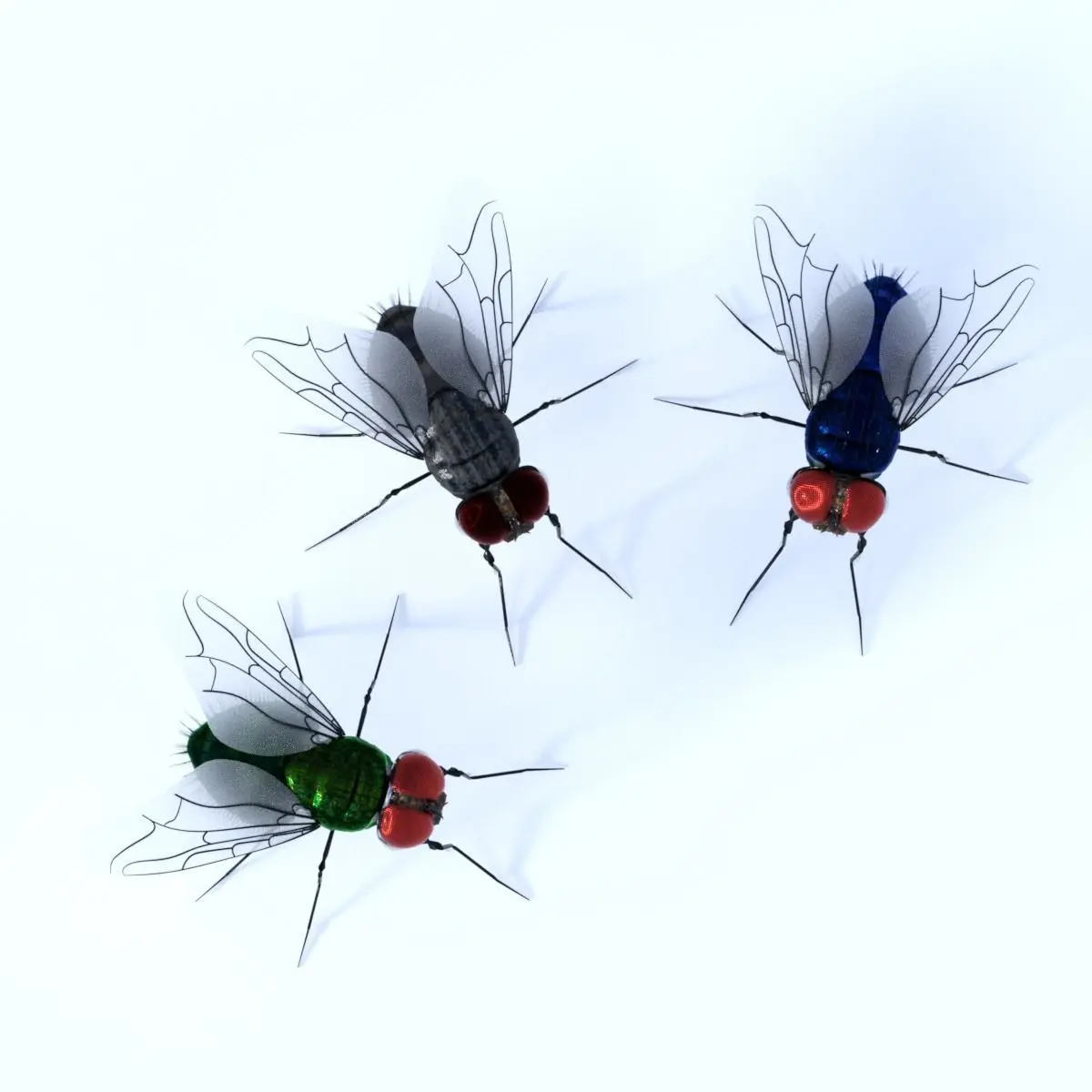 The fly comes with 3 iray materials, green, blue and domestic black.