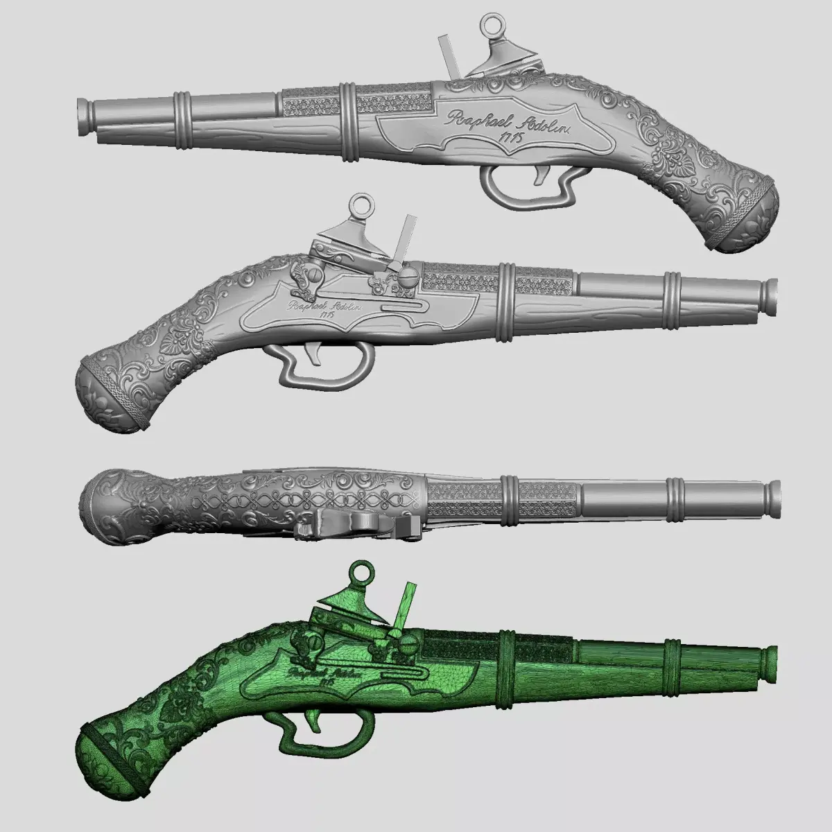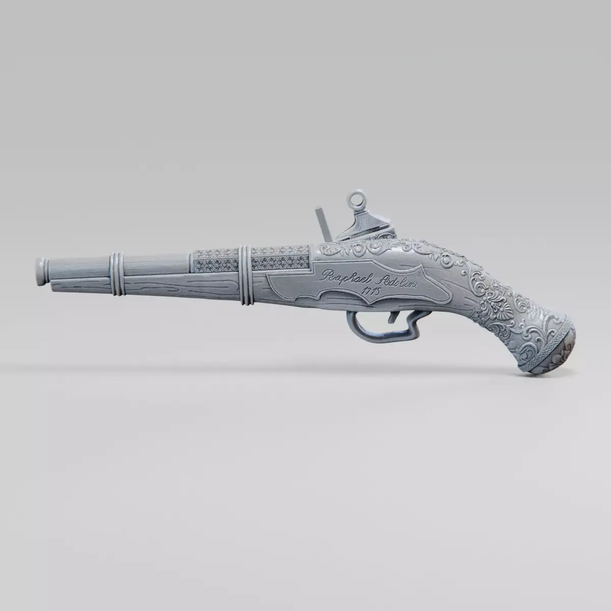This 3D model represents an ancient flintlock pistol inspired by single-shot gunpowder firearms commonly used during the 17th and 18th centuries. The model accurately reproduces key flintlock components, including the flint hammer, frizzen, touch hole, barrel, and a wooden or metal-mounted grip, showcasing the refined yet primitive mechanical design of early firearms.