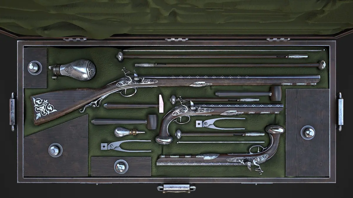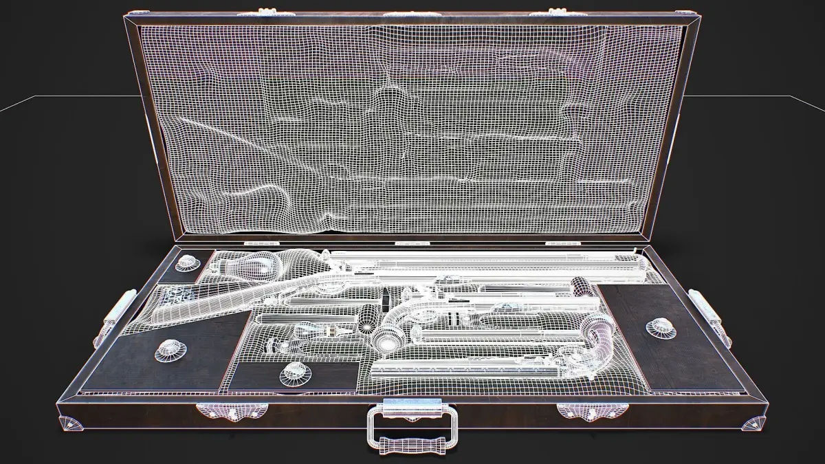 Hello. This is a high definition quality polygon of a Flintlock Gun Case 3D Model with PBR textures. Extremely detailed and realistic. Suitable for movie prop, architectural visualizations, advertising renders, games, VR, AR and other. The archive includes Obj and FBX, Marmoset scene, textures for the Unity: Base color, Metallic, Mixed AO, Normal_OpenGL, Roughness. And also included in the archive textures for UE: BaseColor, Normal, OcclusionRoughnessMetallic. All textures are 4k resolution. The number of materials corresponds to the number of main objects in the scene. There are 28 materials in the scene. The model contains 317 objects. Bullet_Casting_Tool, fabric, Flintlock_gun_case_bottom, Flintlock_gun_case_top, Flintlock_musket, Flintlock_musket_ramrod, Flintlock_pistol, Flintlock_pistol_ramrod, Flintlock_pistol_shelf_flint, Flintlock_pistol_spring, Flintlock_pistol_trigger, lead_bullet, lid, lid_rectangle, lid_rectangle_002, lid_rectangle001, metal_hammer, metal_ramrod, Flintlock_musket_trigger, oiler, powder_bag, powder_flask, ramrod_nozzle, wooden_hammer.