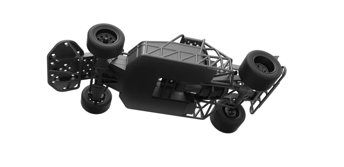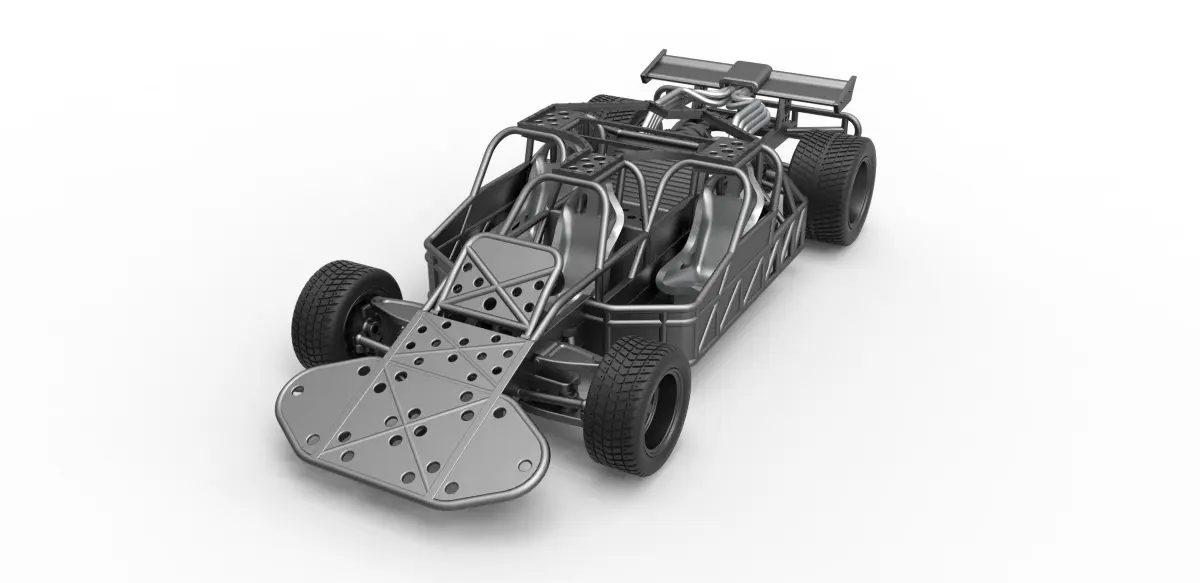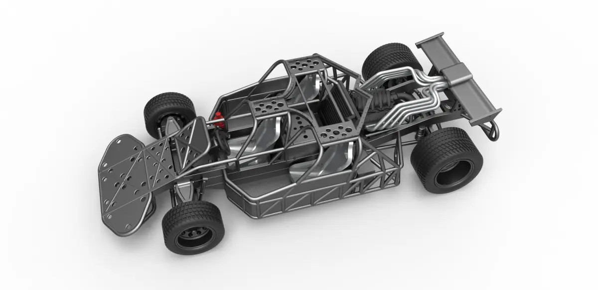 The model consists of parts: Engine, Frame, Front rims, Front tires, Gear shifter, Left exhaust pipes, NOS balloon, Rear rims, Rear tires, Right exhaust pipes, Seats, Spoiler, Steering wheel mount, Steering wheel, Swivel border.