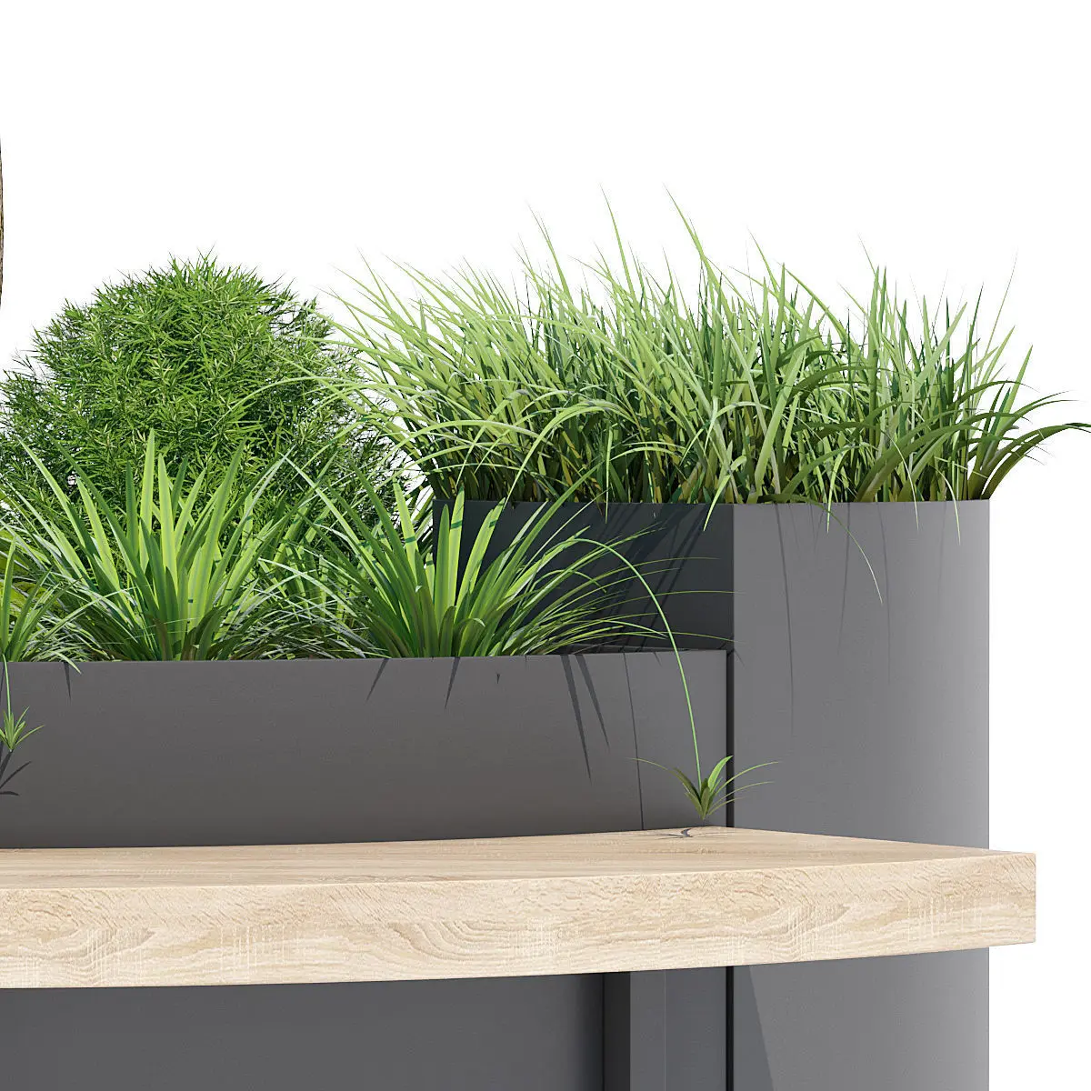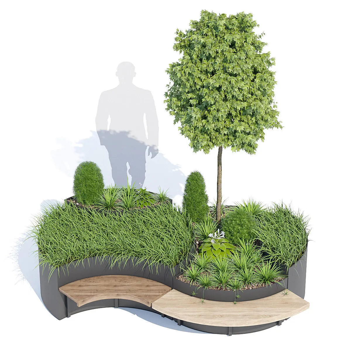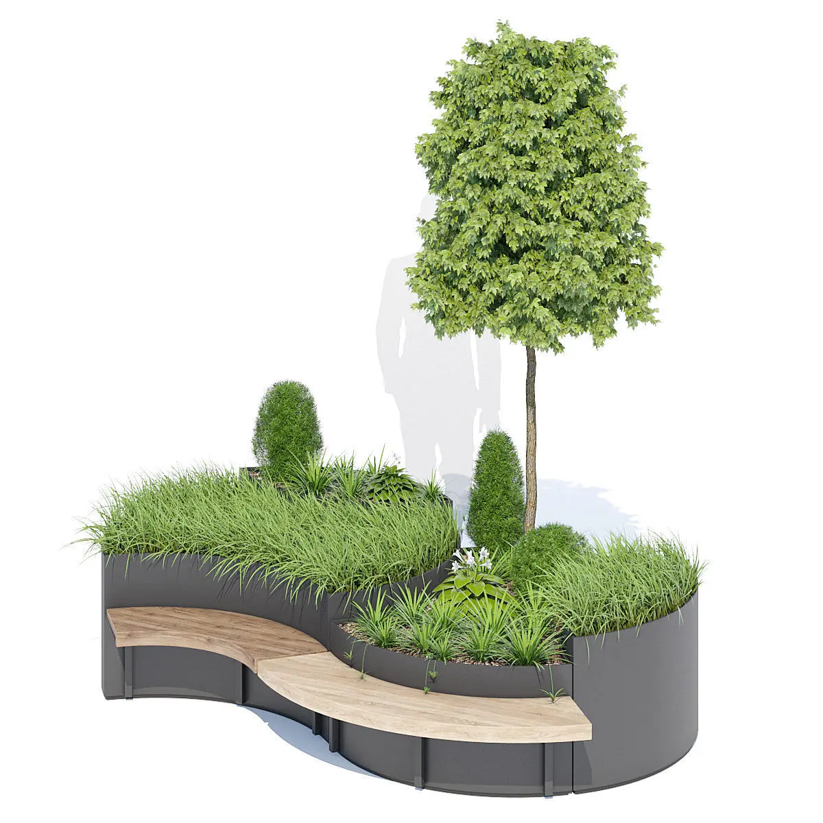 Modular planter made of steel sheet, available in four different formats, equipped on the lower edge with a perimeter frame and flat steel profile stiffening crosses, and with special fixings to adjust according to the surface slant. Thanks to the two concave and convex forms, the elements can be placed against each other both in linear or radial layouts, to make infinite combinations. Furthermore, thanks to the special styling, concave or convex wood seats can be fixed to the bigger components.