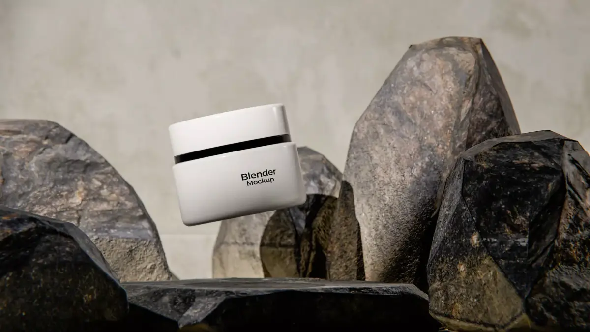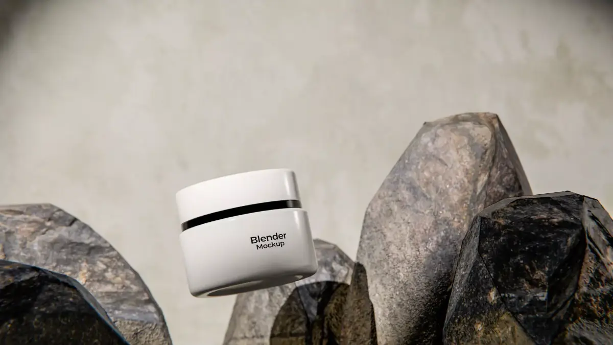 Elegant 3D render of a floating white cosmetic jar among natural stones. Minimalistic product mockup design for skincare, beauty branding, or luxury cosmetic presentation visuals.