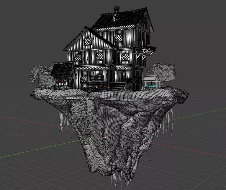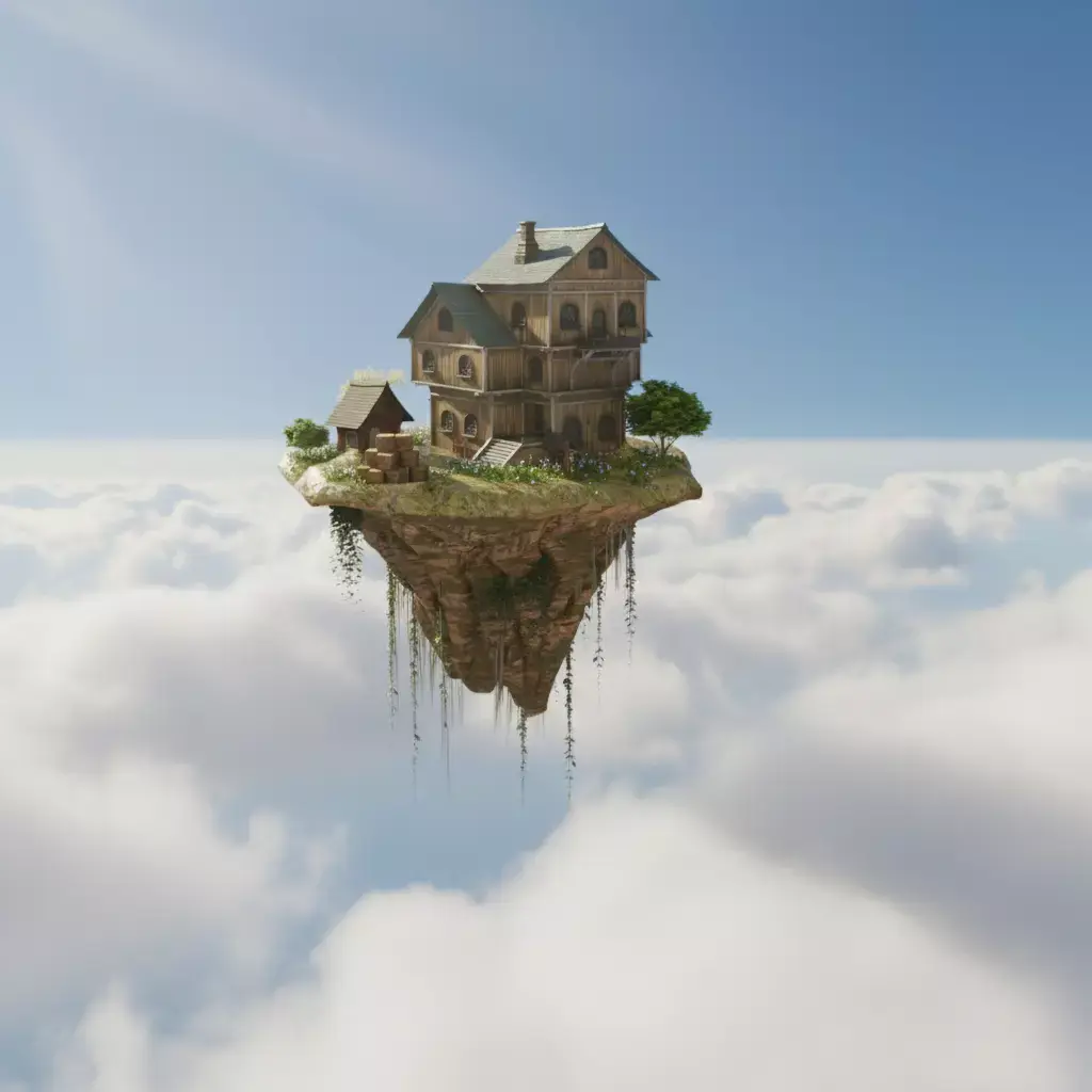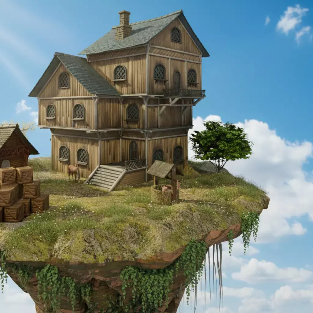 This high-quality 3D environment features a detailed floating island with a wooden house, designed for cinematic scenes, games, and concept art. The asset presents a peaceful sky-island atmosphere, combining natural elements with handcrafted architectural details.