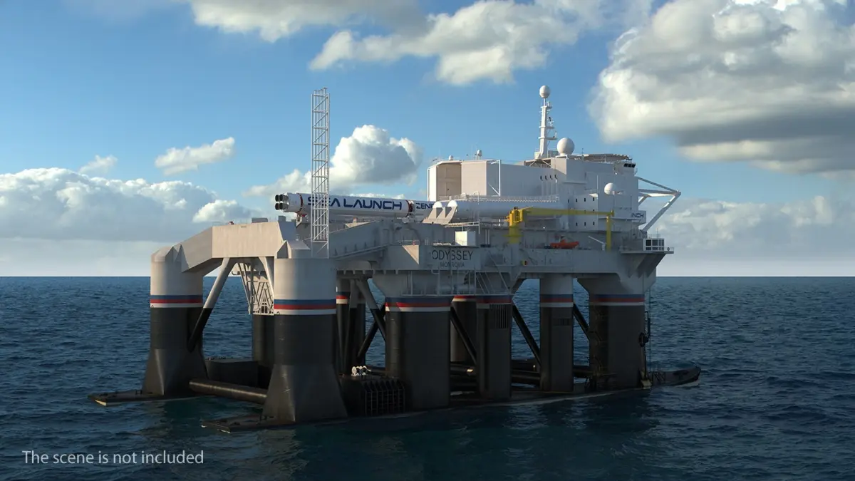 Floating Launch Platform Odyssey Rigged is a three-dimensional model of a specialized ocean-based launch platform used for launching rockets into space.