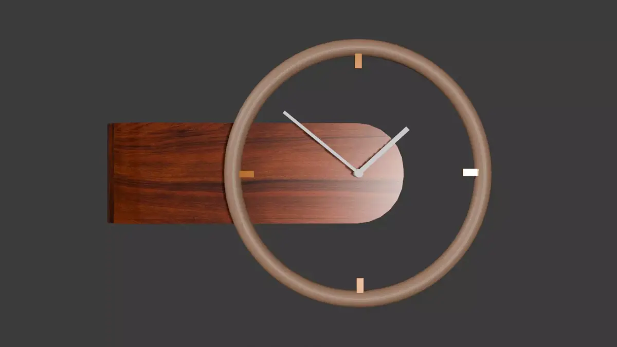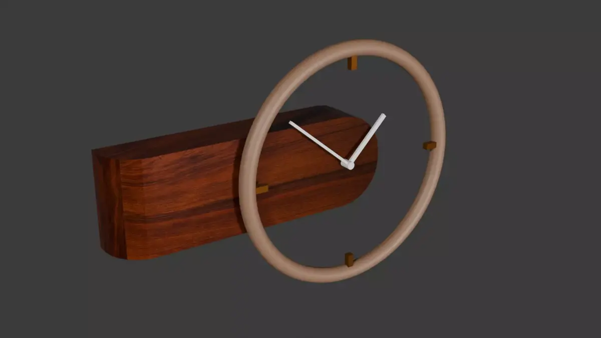 This modern wall clock features a distinctive sculptural design with a wooden base and a seemingly floating circular ring. The hour markings are positioned on the ring, while the clock hands extend from the center, pointing outward toward the corresponding hour indicators. The contrast between the solid wooden base and the open, airy ring creates a striking visual effect, giving the impression that the timepiece is suspended in mid-air. Crafted with clean lines and smooth surfaces, the clock emphasizes minimalist elegance while remaining functional and easy to read. Its unique floating-ring design adds depth and dimension to any wall, making it an ideal centerpiece for living rooms, offices, or creative spaces. Combining natural wood textures with a contemporary geometric form, this clock blends modern artistry with practical timekeeping. Perfect for enthusiasts of innovative design or those looking for a statement décor piece, it transforms a simple wall into a gallery-like display.
