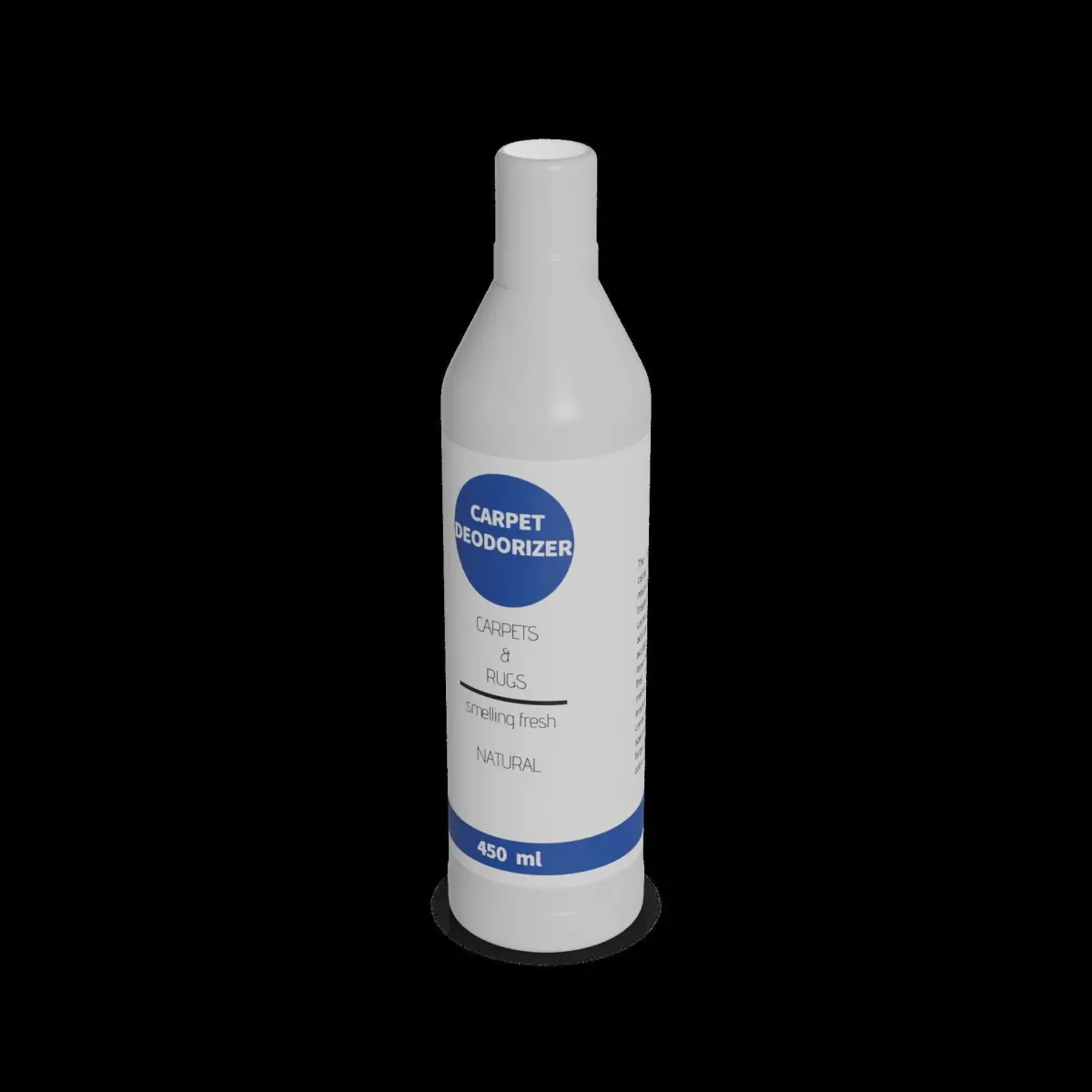 Carpet Deodorizer: Keep your carpets smelling fresh and clean with this carpet deodorizer. The packaging features a charming design with a picture of a field of flowers, evoking a sense of freshness. Packaged in a convenient shaker bottle, the deodorizer is a soft pink color. The label includes instructions for use and suggests sprinkling the deodorizer on your carpets before vacuuming for best results.
