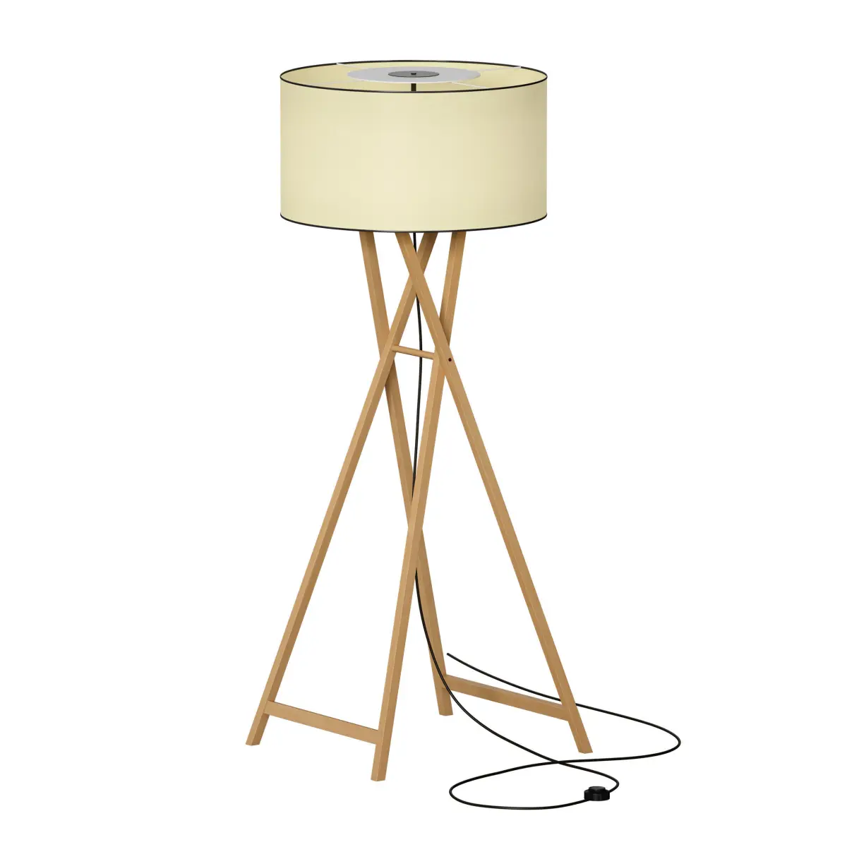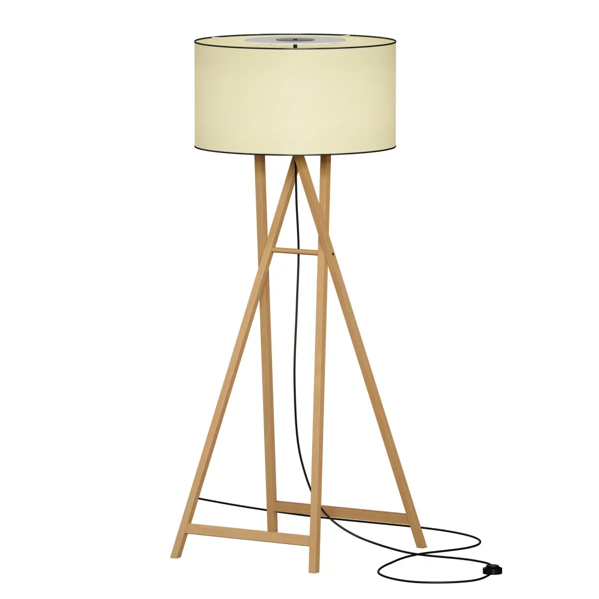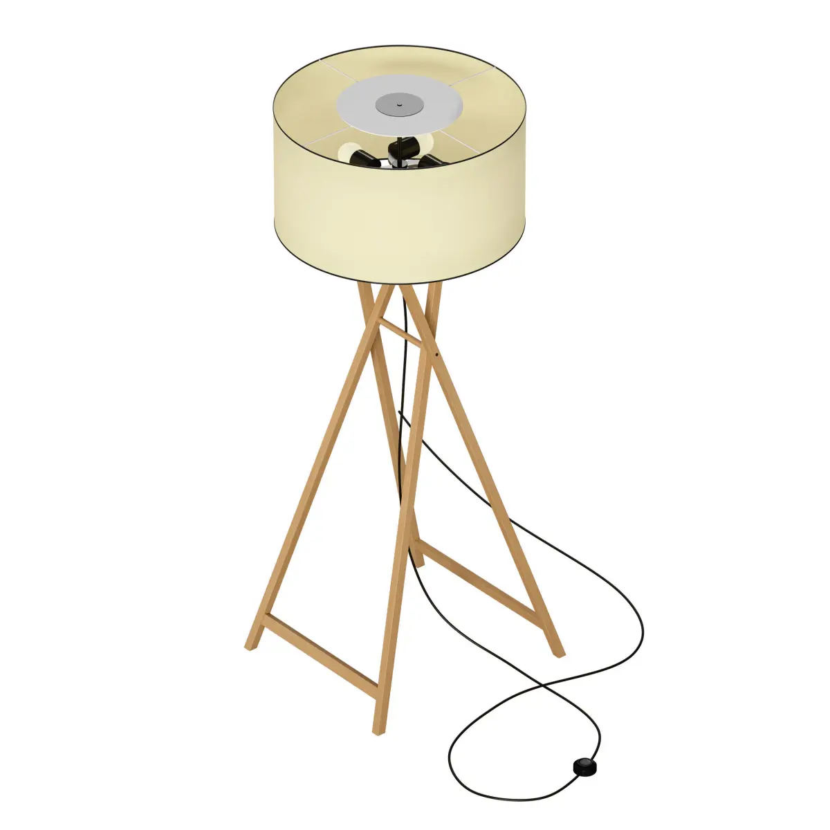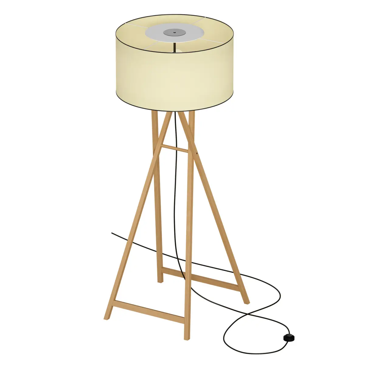 3D model of a floor lamp with a round fabric lampshade. The legs of the floor lamp are made of wood in the form of a folding tripod. Hanging cable, floor switch.