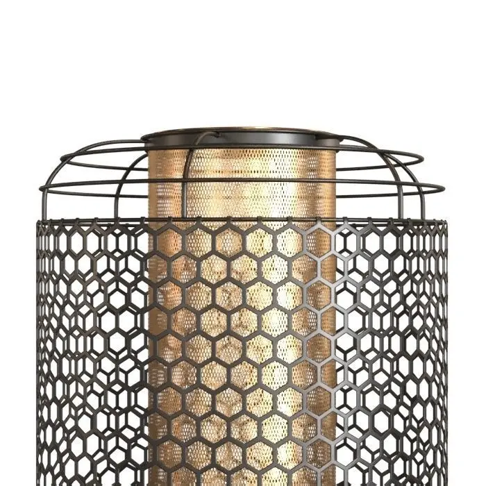 Floor lamp by Archer from Dutchbone. Its main feature is a metal lampshade with perforations in the form of hexagons, in the center is a gold mesh. Installed on three metal legs.