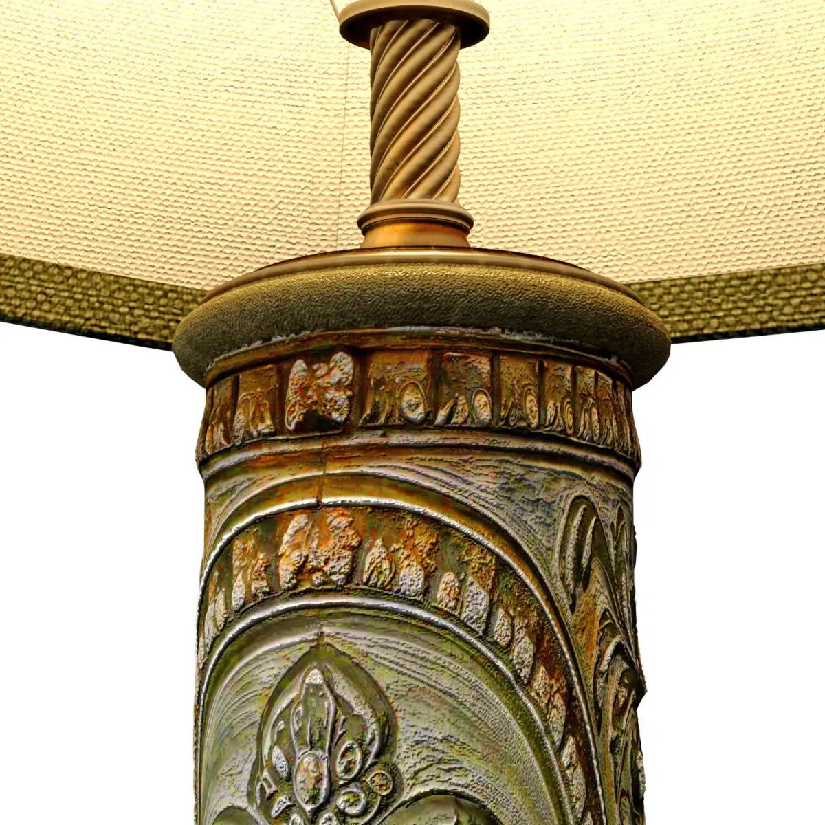 A charming floor lamp with a textured base made of aged patinated metal (green copper) and a fabric shade for decorating the living room, office, study, bedroom, bedside table in oriental style,Arabic Ceramic Floor Lamp Oriental wood,Morocco Copper Floor Lamp,Islamic Copper Pattern,Eastern Floor Lamp,Majlis Copper Floor Lamp,Arabic Style Lamp for Home Decoration, Bedroom Lighting,Oriental pattern