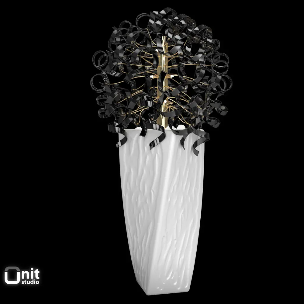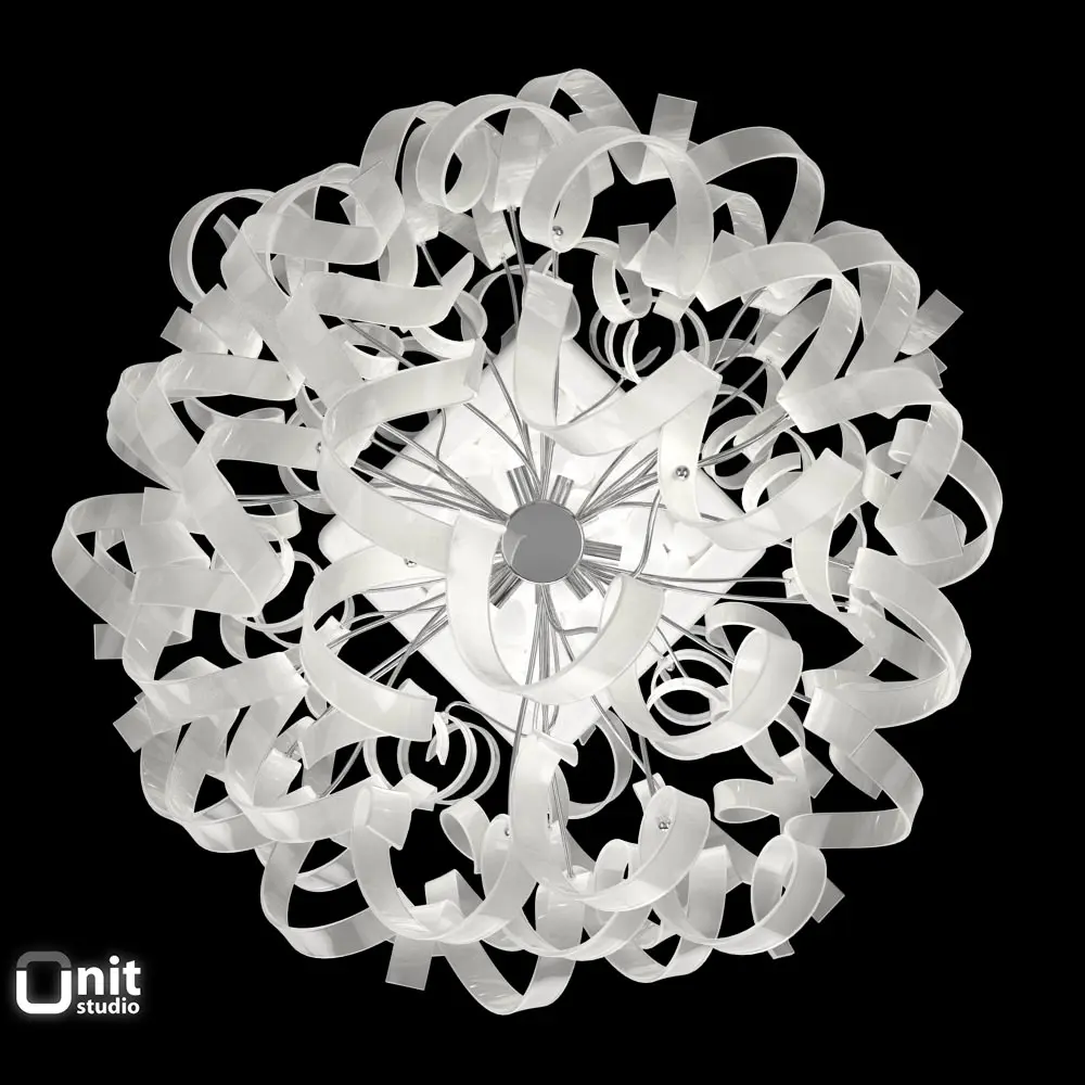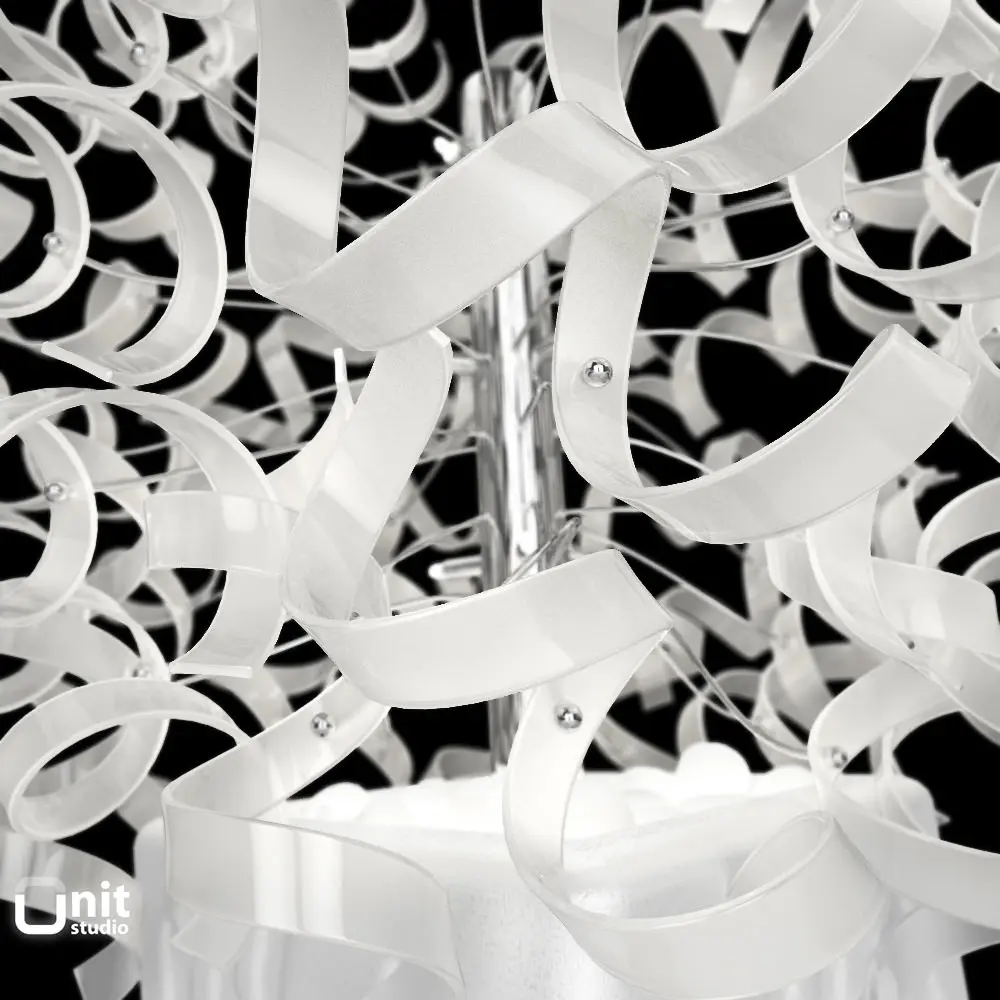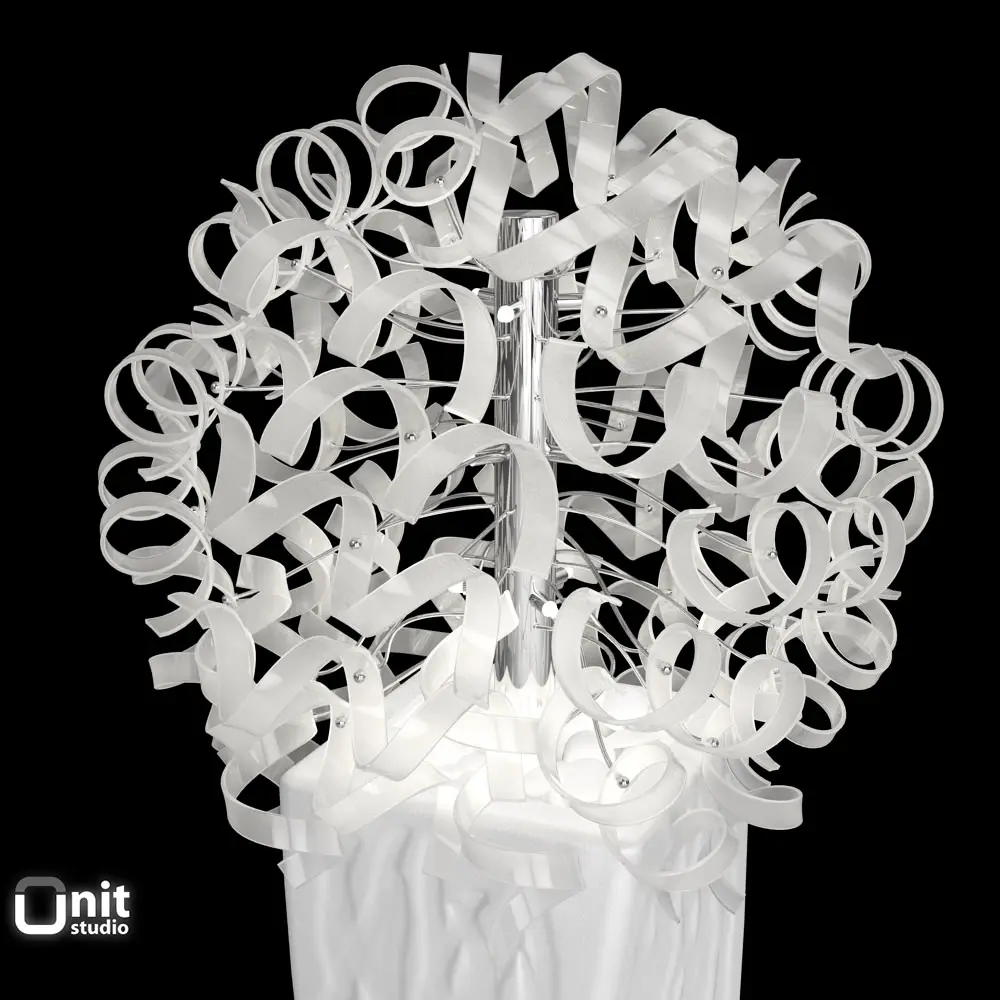 Floor light Astro by MetalLux with 42 glass curls and polished metal structure, planted in a decorated white ceramic vase filled with pebbles.Diameter 60cmHeight 110cm