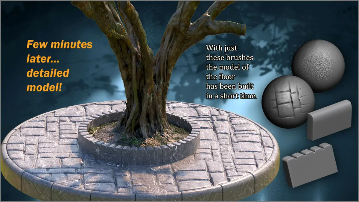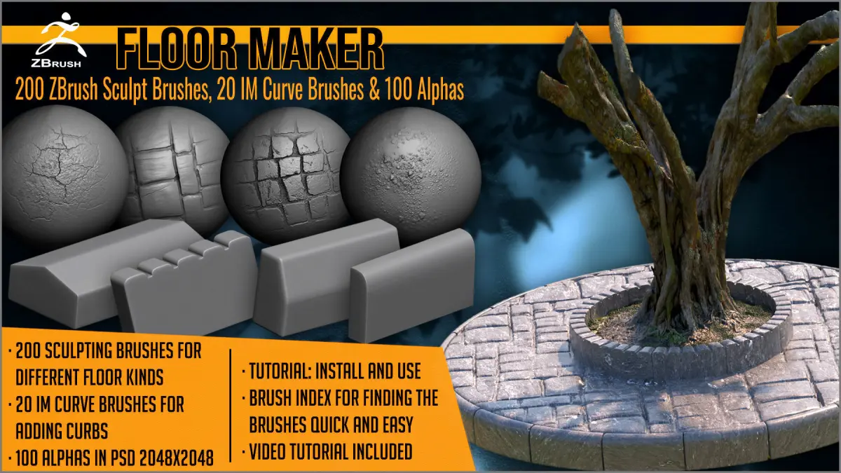 Floor Maker is a complete pack of brushes for creating floor, pavement and ground models, that includes 200 sculpting brushes and 20 curb IM curve brushes.