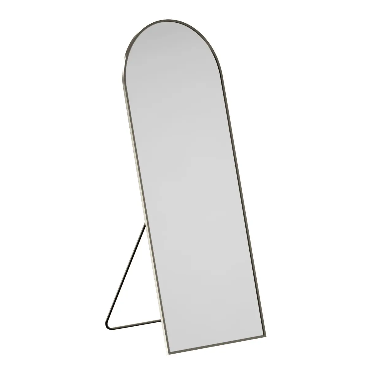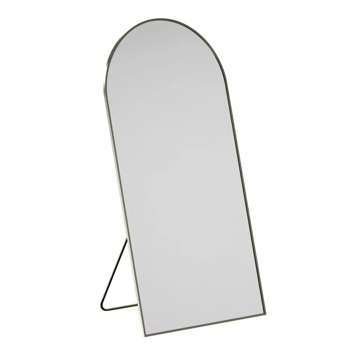 3D model of a semicircular floor-standing wardrobe mirror. The full-length mirror is installed on the floor using a folding stand leg. The mirror is a rectangle with a semicircular top. The mirror is framed with a metal profile. Black matte back. The mirror is made in two sizes, narrow and wide.
