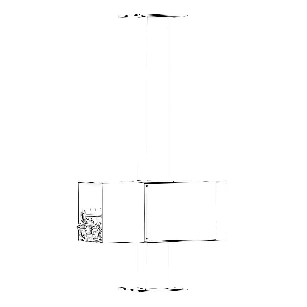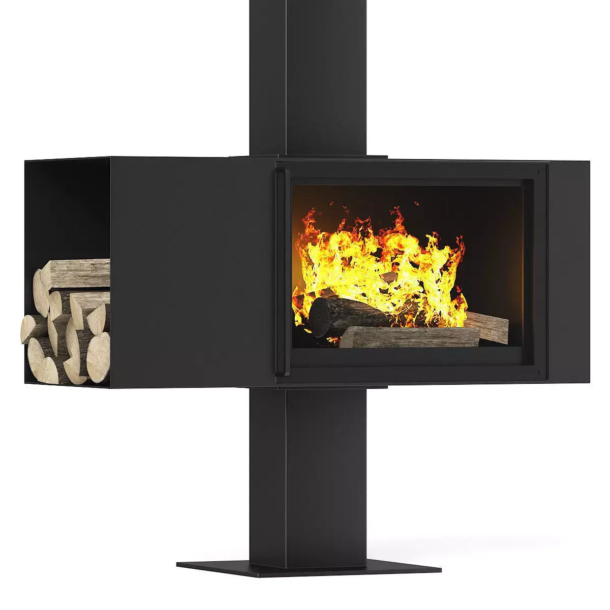 Modern looking fireplace with wood shelf on the left side and glass door. This 3D model contains illuminative fire material.