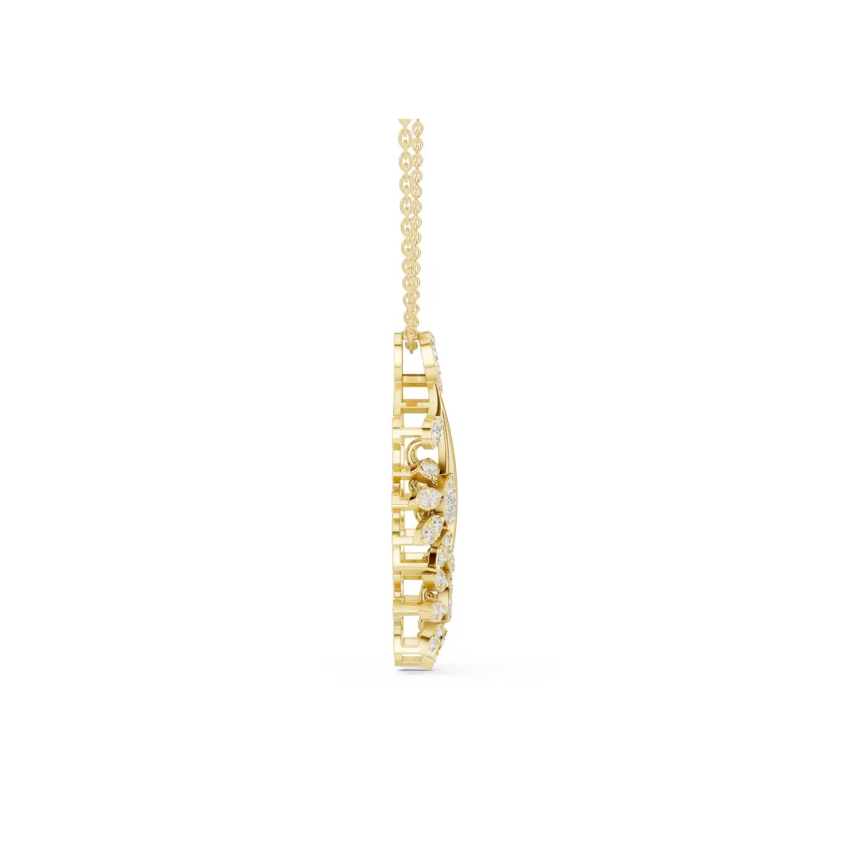 This pendant features a sophisticated drop-style composition beginning with a pear-shaped diamond at the top that elegantly connects to flowing gold strands. These delicate strands cascade downward into symmetrical diamond clusters, forming a beautiful floral-inspired structure.