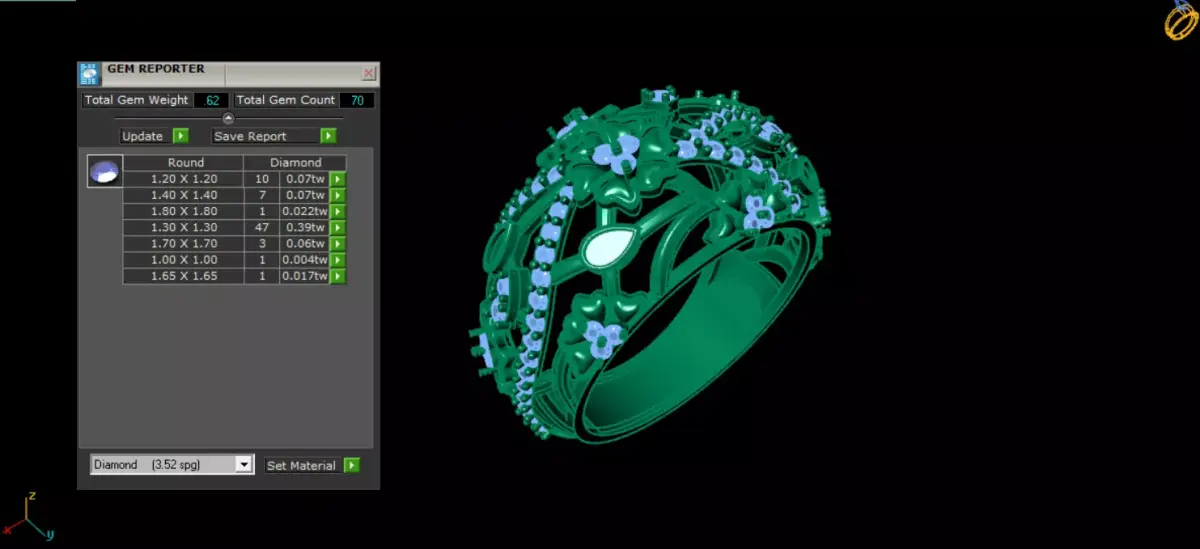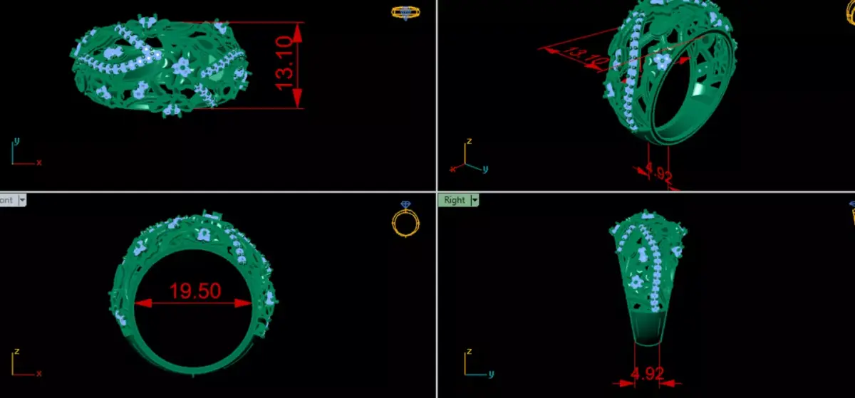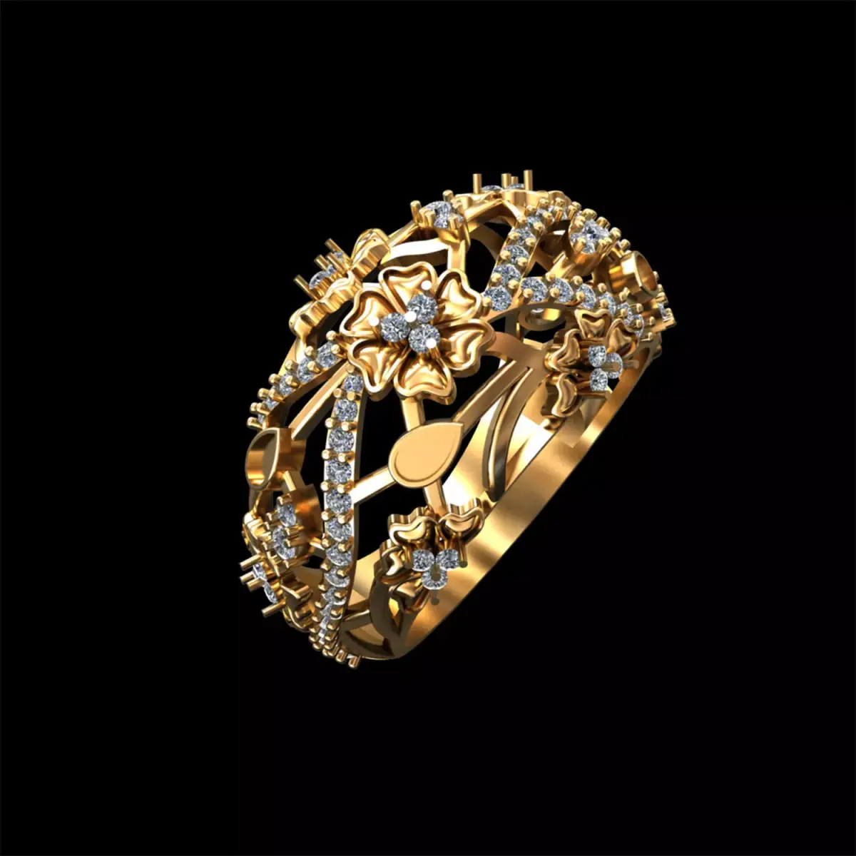 This elegant floral diamond ring CAD model features an intricate openwork design inspired by blooming flowers and flowing organic lines. The ring showcases multiple floral motifs accented with pavé-set round diamonds, creating a luxurious, feminine, and timeless look.