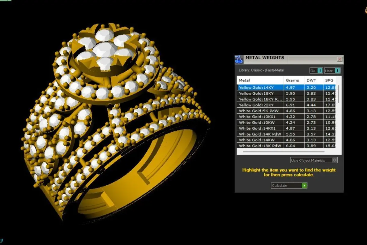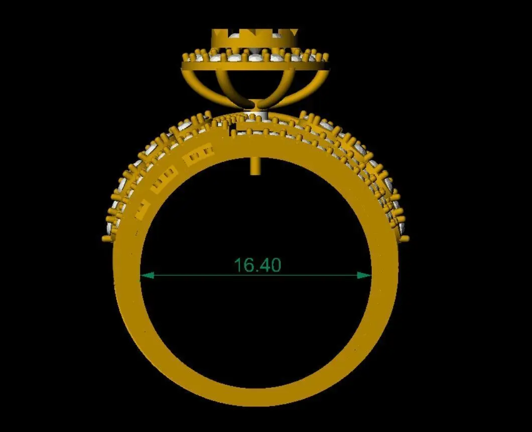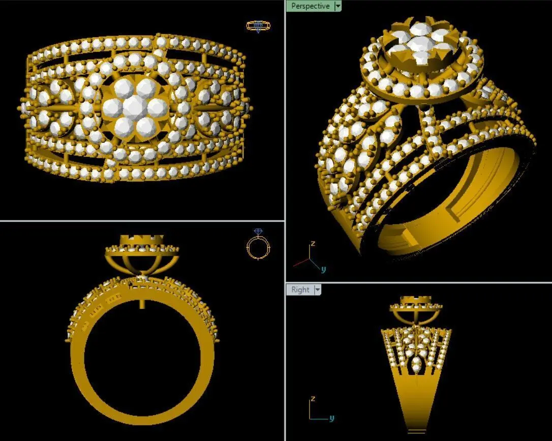 This 3D CAD model features an intricate and luxurious multi-layer floral ring, designed to make a bold and elegant statement. The ring showcases a raised round floral centerpiece adorned with brilliant round diamonds, gracefully surrounded by lattice-inspired arches and leaf-set stones. Each tier of diamonds is meticulously arranged to add depth, radiance, and dimension to the overall structure.