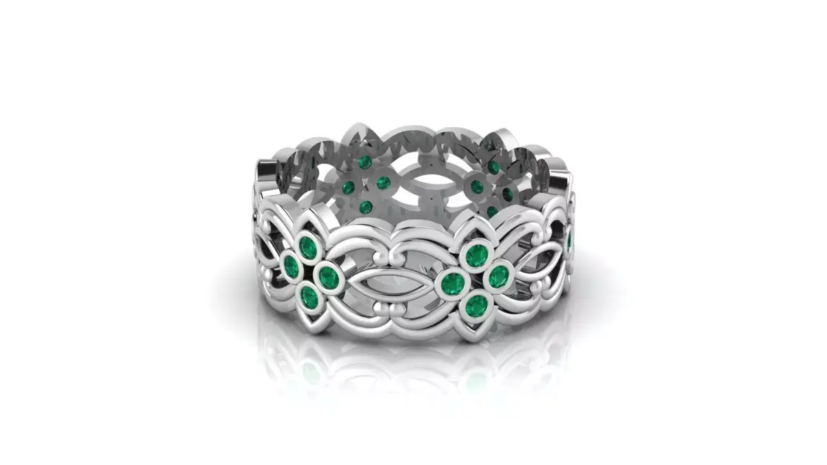 Elegant eternity bands designed with intricate floral filigree patterns, available in both yellow gold and platinum. Each ring features sparkling round-cut diamonds set within delicate flower motifs, creating a timeless and romantic design. Perfect as wedding bands, anniversary rings, or statement pieces, these rings combine artistry with luxury for a truly unique look.