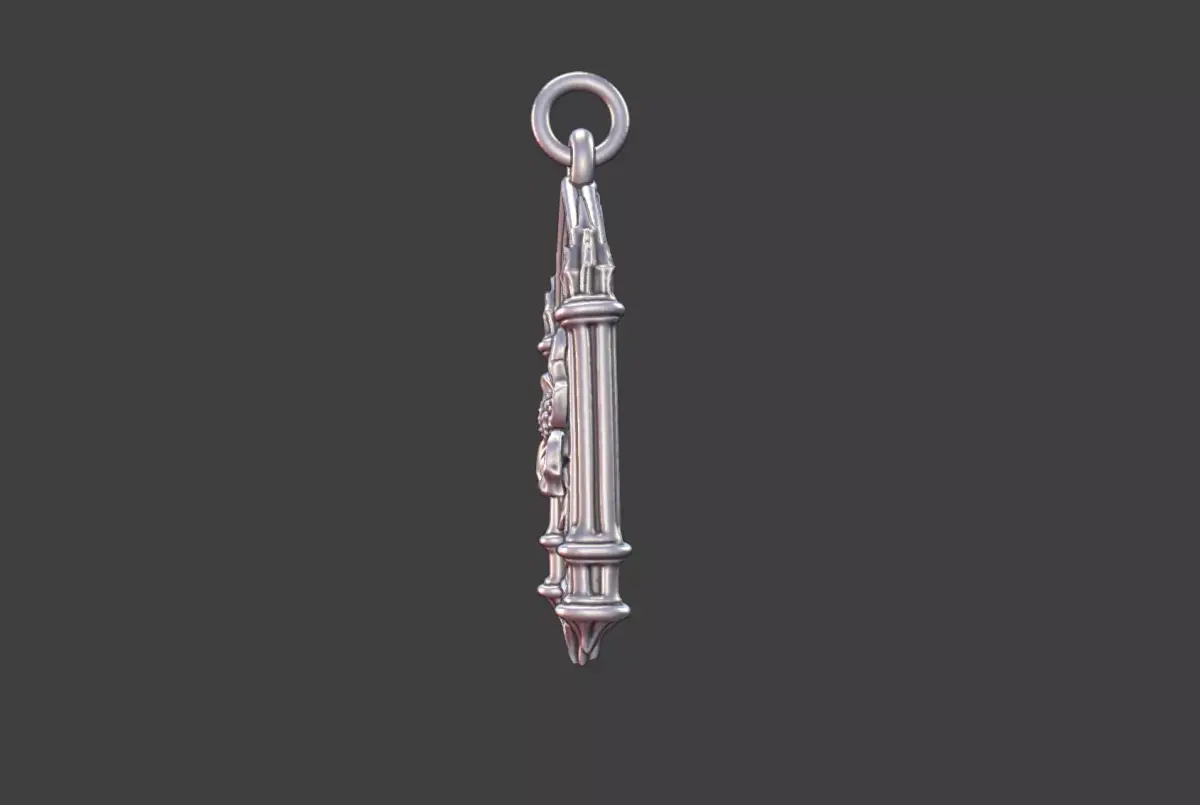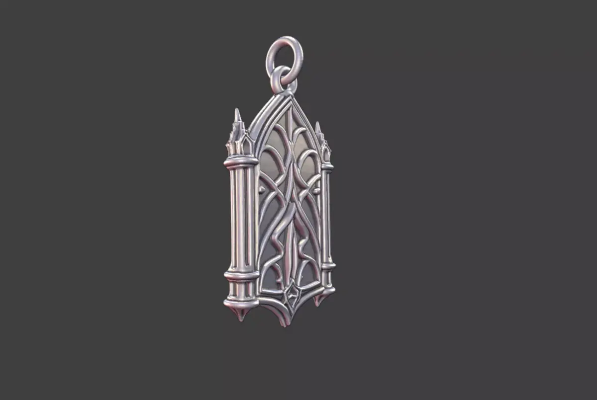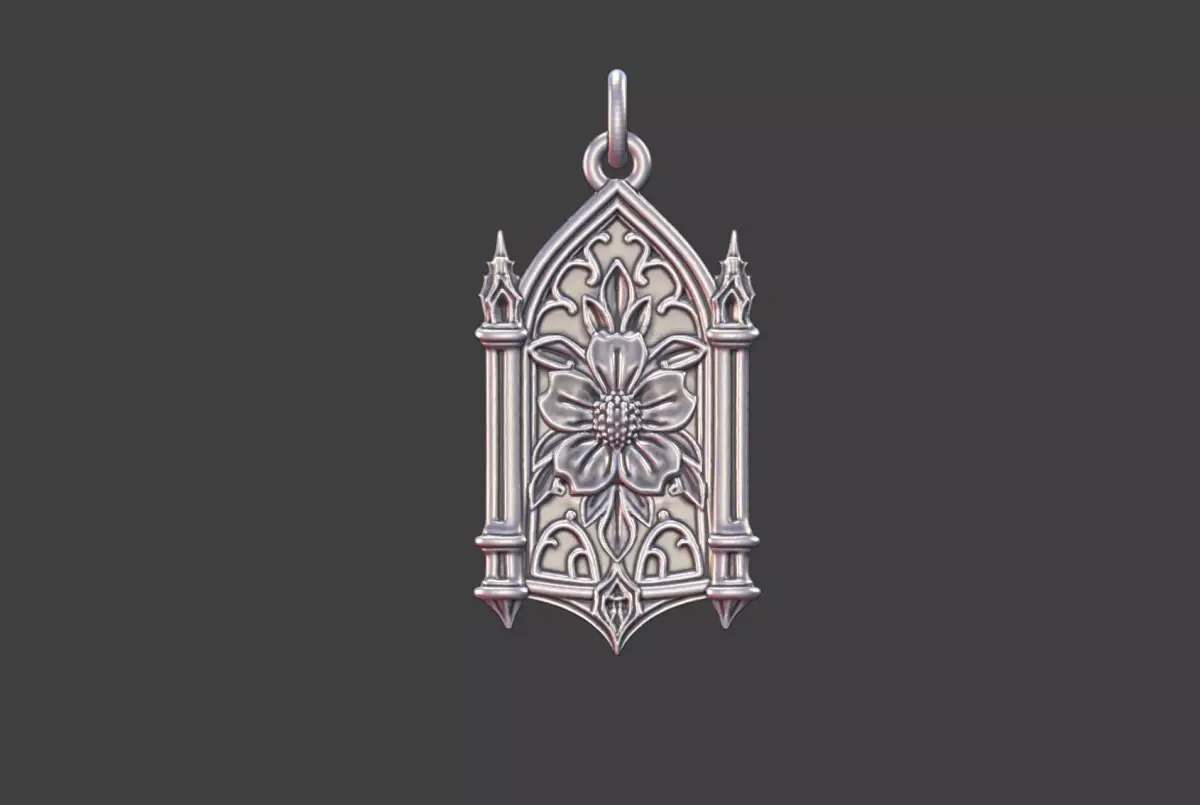 This floral gothic cathedral pendant features intricate botanical and architectural motifs inspired by gothic cathedral design. Delicate floral patterns intertwine with pointed arch elements, creating a striking ornamental pendant with a sense of depth and elegance. The design is suitable for gothic, architectural, or nature inspired jewelry collections.