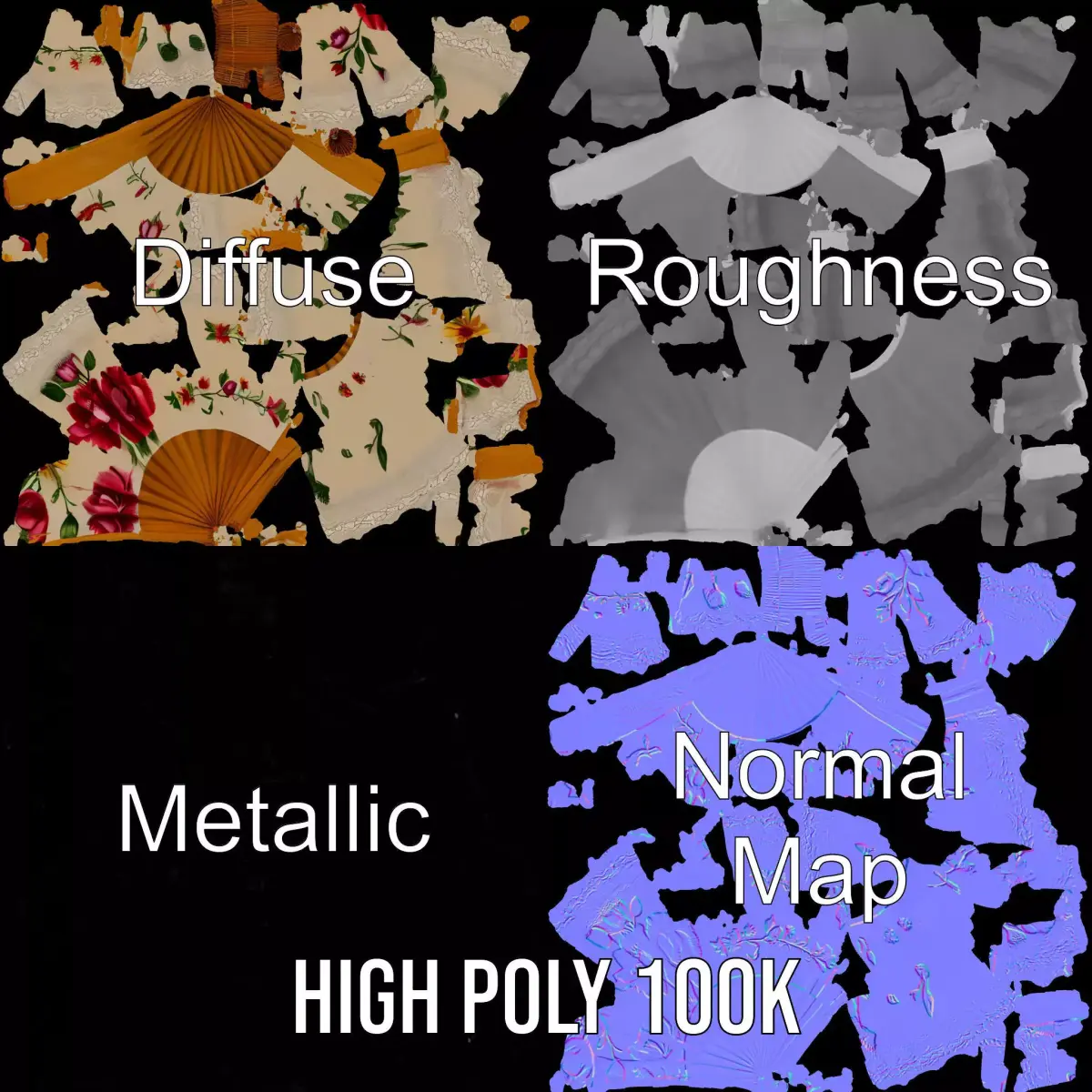 This exquisite Floral Lace Fan model pack features a delicate design with intricate floral patterns and lace details. Ideal for period films, theatrical productions, or sophisticated fashion presentations. Each model has 3 levels of detail: low-poly(1000 triangles for mobile), middle-poly(10 000 triangles for environment), and high-poly(100 000 triangles), which allows for the use of this model in production rendering (such as 3ds max, Maya, Cinema4d, Blender, Vray/Corona/Cycles and all other), game engines (Unity and Unreal compatible), and interactive presentations, providing a choice of detail based on the LOD System principle. The model's textures are PBR, Diffuse, NormalMap, and reflection/roughness/metallic, which are suitable for any modern rendering engine. All models are accurately unwrapped and have no overlapping UV. This model is perfect for enhancing scenes requiring elegance and classical touch. All textures are 4096*4096 in size. If you like the model, please like and leave a comment.