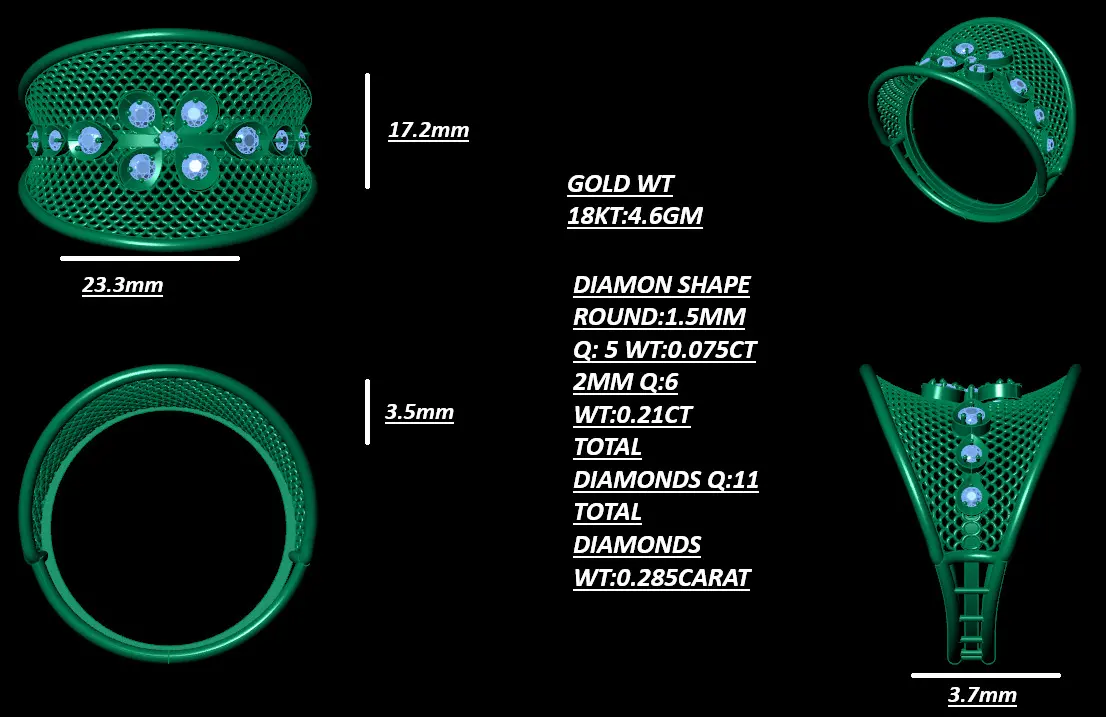 Product Description:This exquisite ring is a statement piece that blends intricate craftsmanship with elegant design. The front of the ring features a domed mesh pattern, crafted in high-polish 22K yellow gold, creating a luxurious and airy backdrop.
