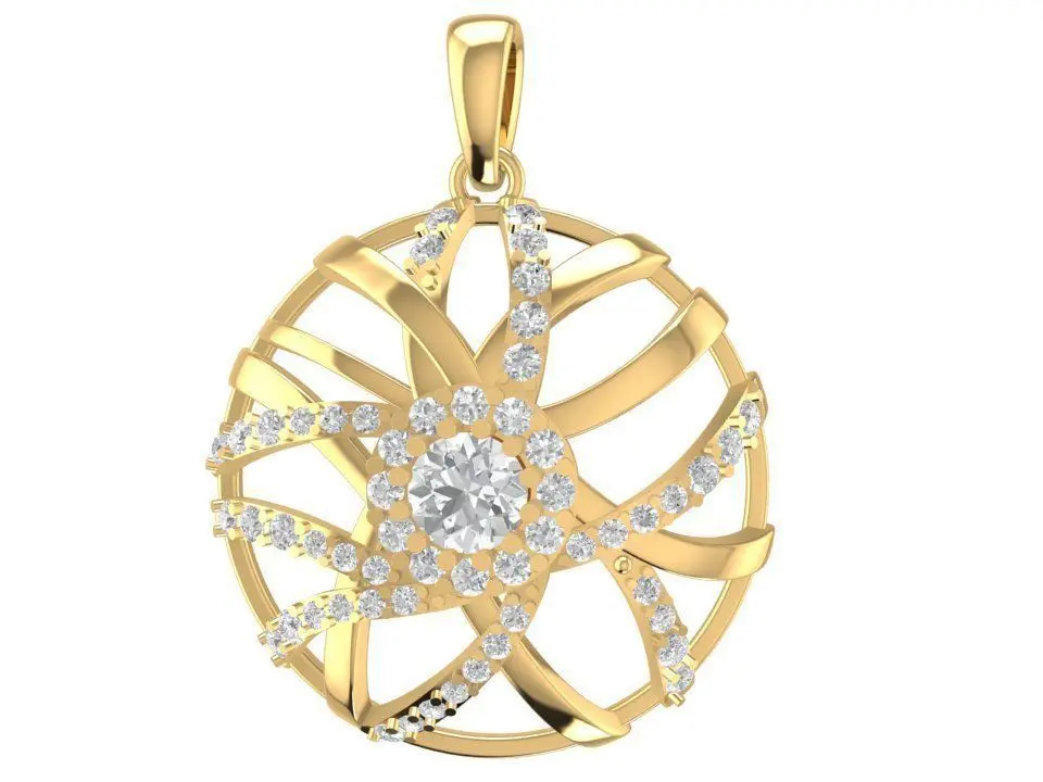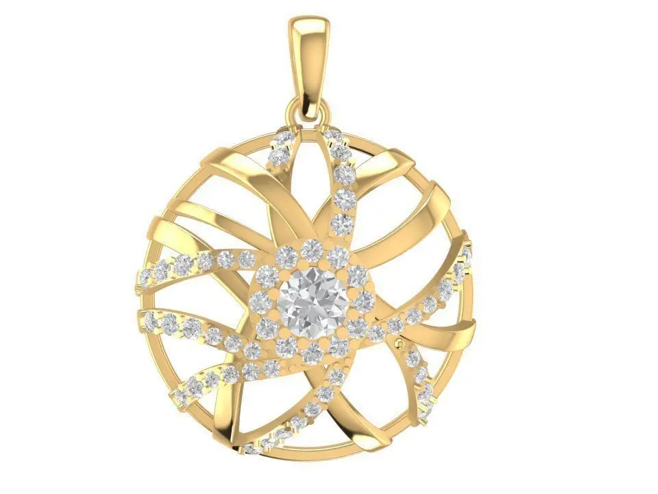 This floral round diamond pendant features an elegant spiral petal design set with sparkling diamonds and a brilliant gemstone at the center. The dynamic circular form symbolizes eternal beauty and energy, making it perfect for both daily wear and special occasions.