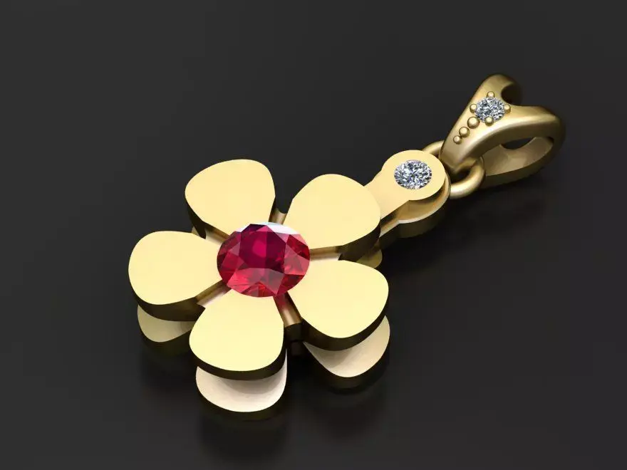 A delicate 3D printable flower-shaped pendant in gold, featuring a brilliant red gemstone at the center and sparkling diamonds along the bail for added elegance. A timeless blend of nature and luxury.