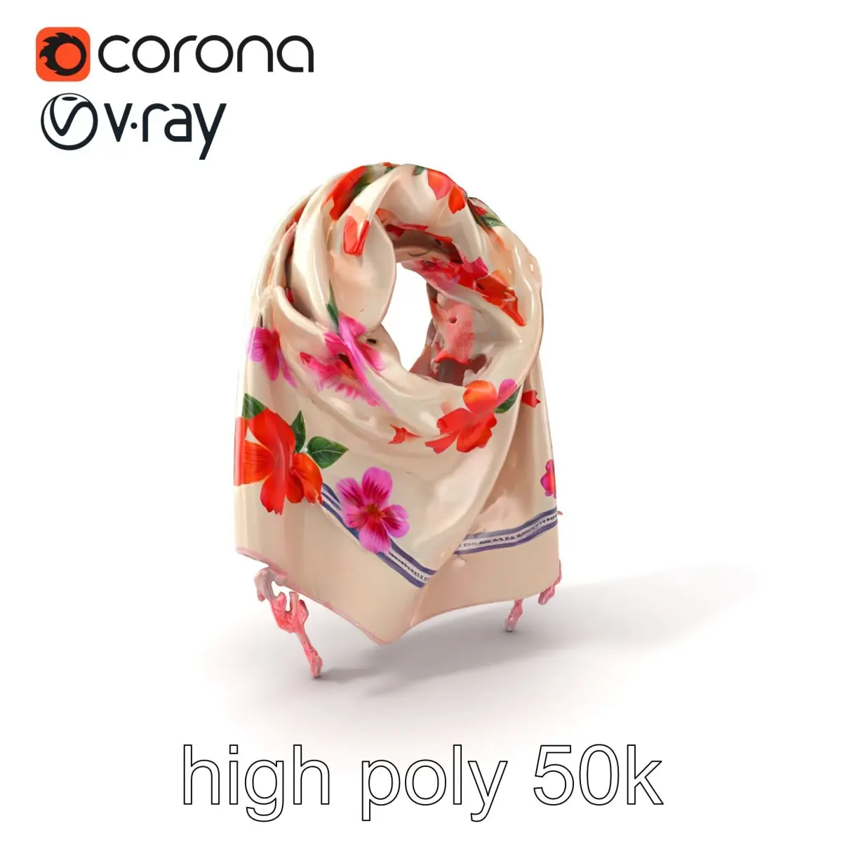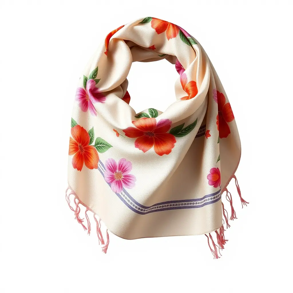 This elegant silk scarf model features vibrant floral patterns and delicate fringe details, making it suitable for fashion visualizations, virtual clothing stores, or character accessories in simulations.