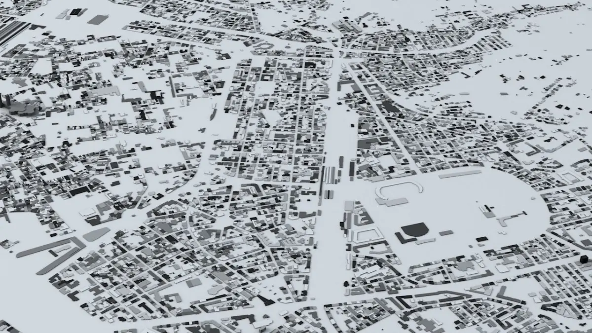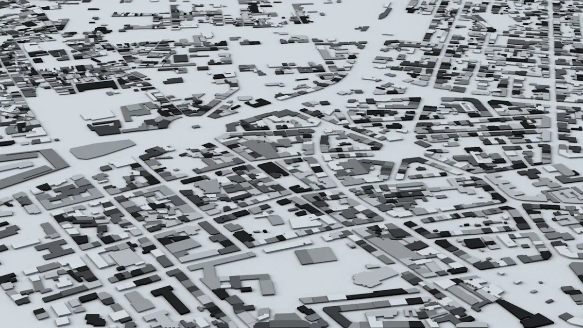 - the model is positioned on a flat surface (all buildings are on the “floor” - no elevation data included)