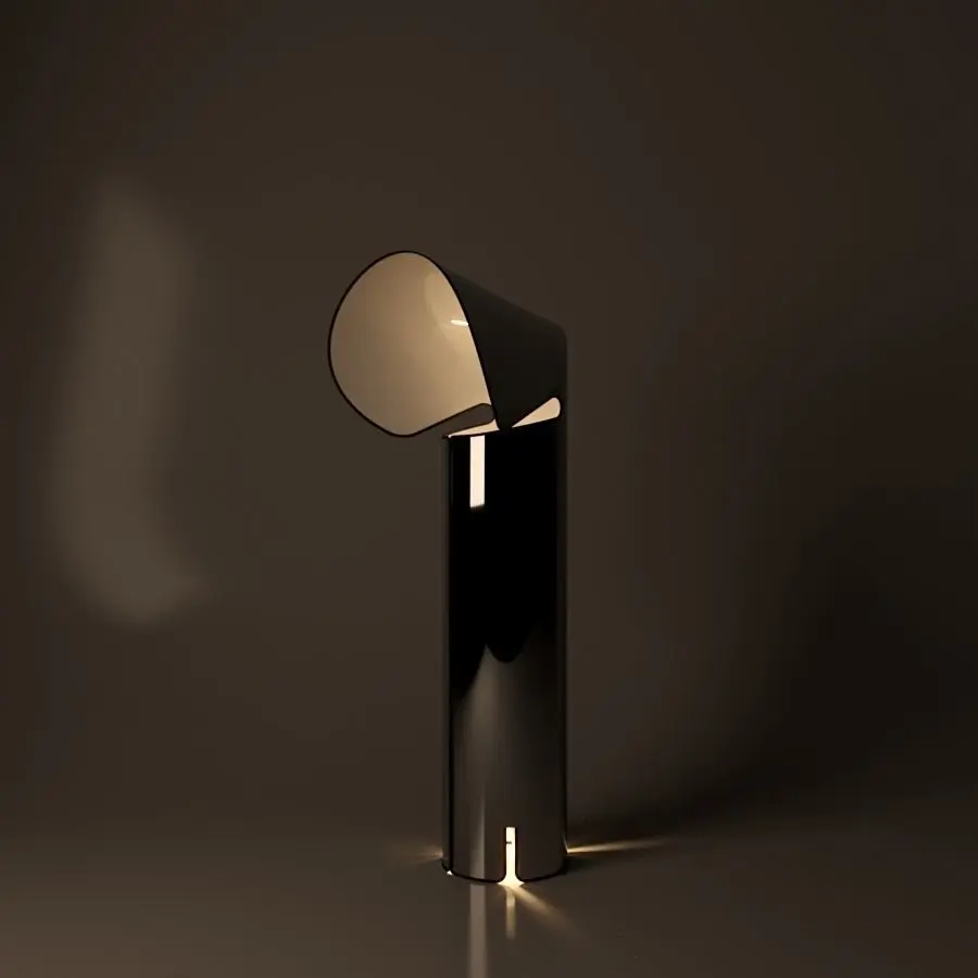 Floor lamp composed of a laser-cut stainless steel reflector body, internally coated with an opaque white plastic film, folded and closed by hooks obtained directly from the sheet. A black extruded TPU gasket is applied to the entire profile of the body. The internal base in painted steel gives stability to the body which is fixed on it and supports the lamp holder.
