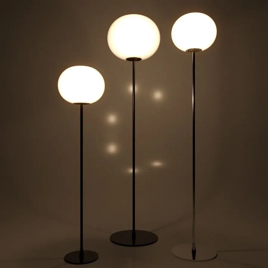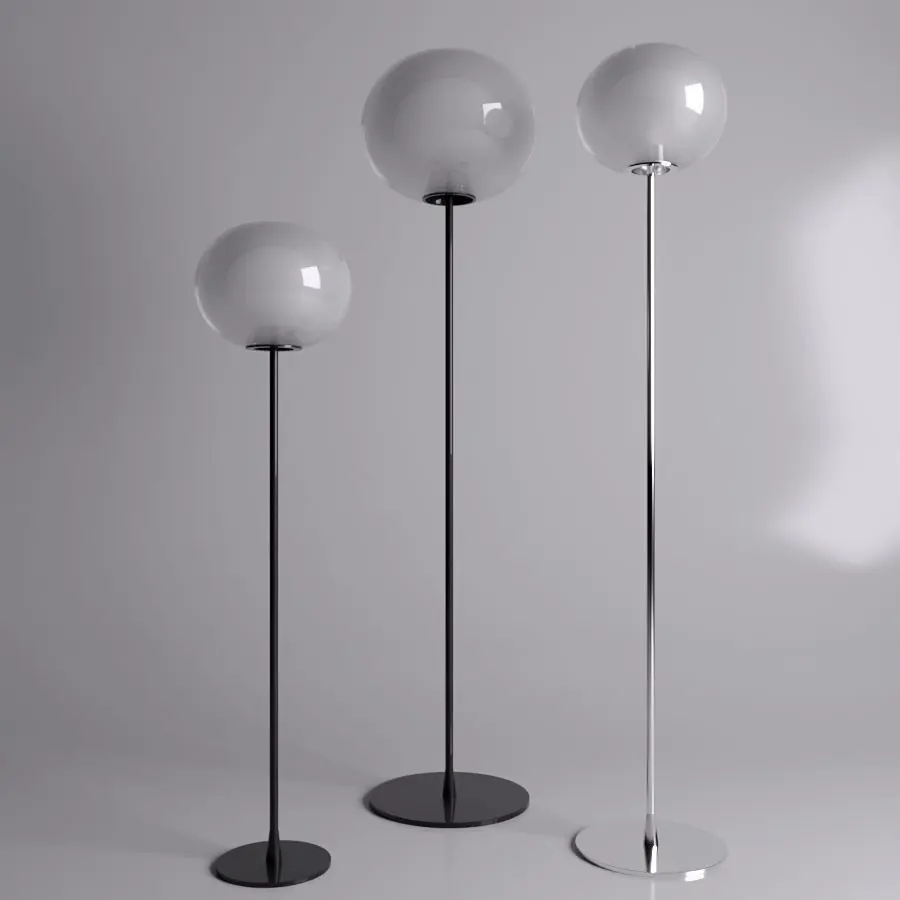 Floor lamp with diffused light. Diffuser consisting of a hand-blown, cased opaline glass with an external acid-etched finish and a threaded ring nut in die-cast aluminum alloy with a galvanic alodine chrome finish. High thickness steel base, tubular steel stem and die-cast aluminum alloy diffuser support, all painted in liquid gray. On the cable there is the electronic dimmer that allows the regulation of the light intensity in steps.