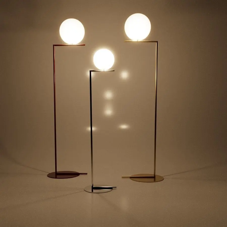 Floor lamp providing diffused light. Frame in brass, brushed and transparent varnished or chrome steel. Blown glass opal diffuser. Dimmer on the power chord.
