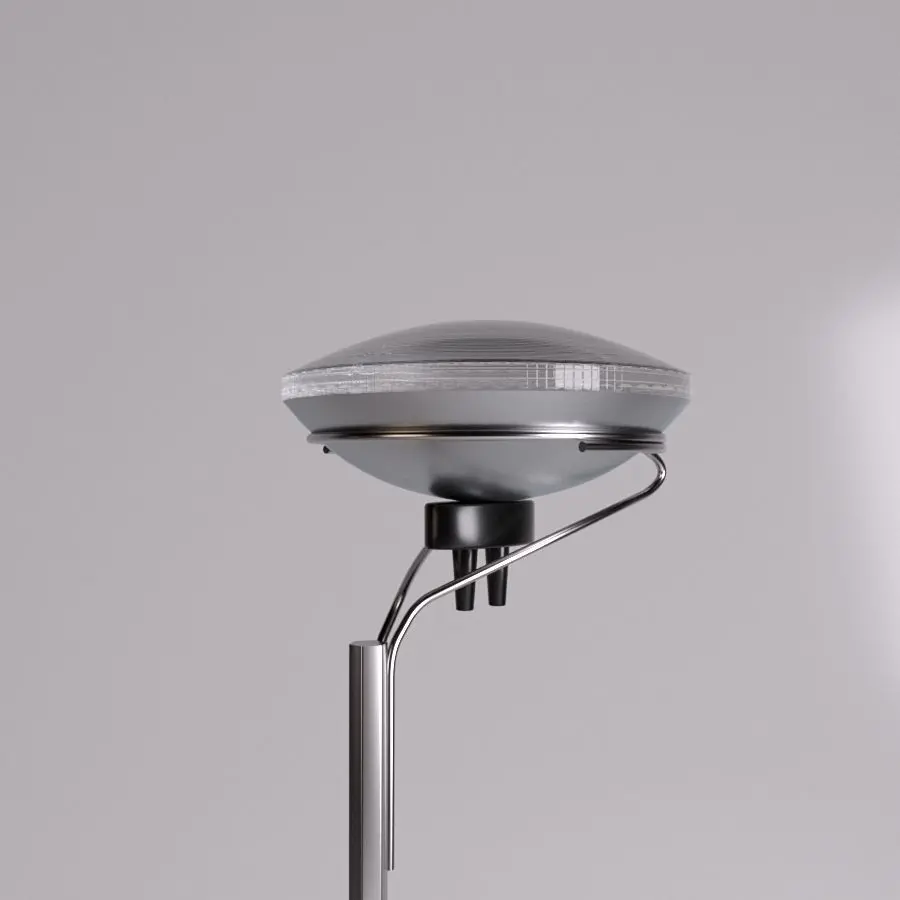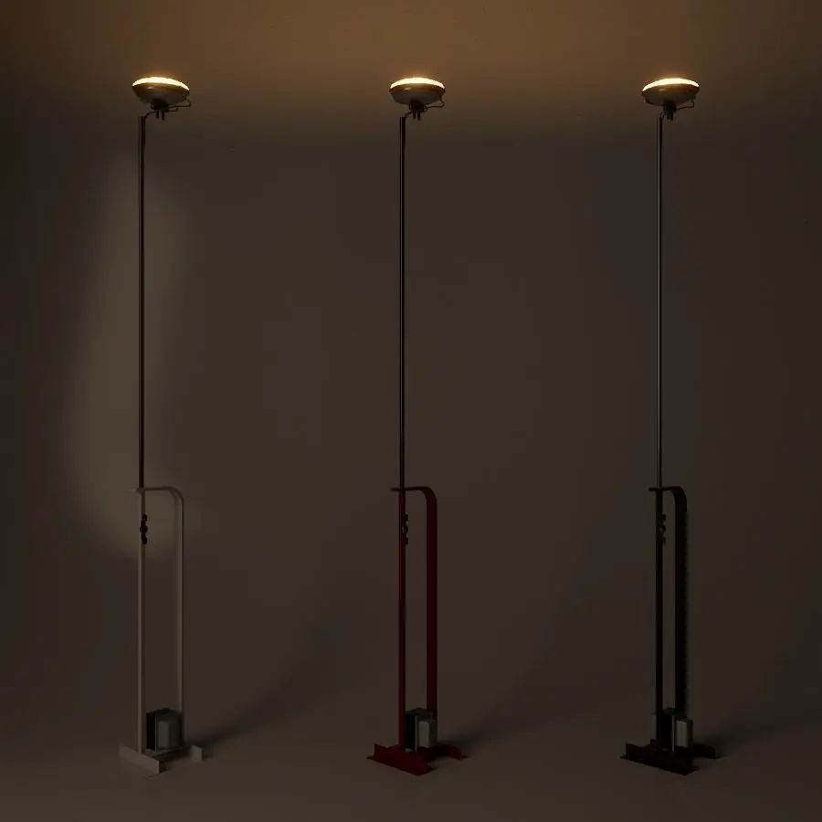 Indirect light floor luminaire. Base in sheared and folded steel and structure in steel sections, both liquid painted, in various colors. Stem with hexagonal section in nickel-plated brass. The telescopic movement of the rod allows the height of the device to be adjusted.
