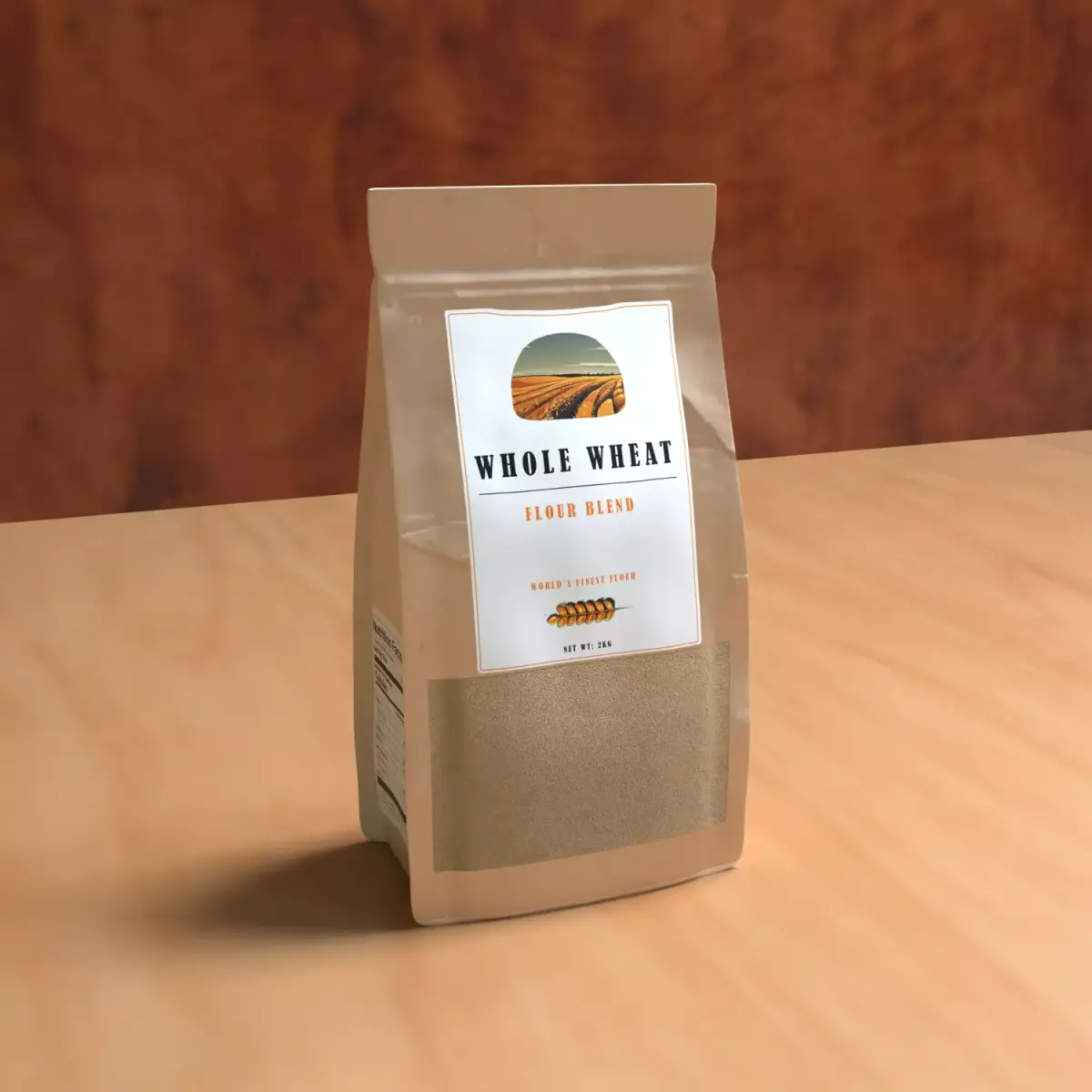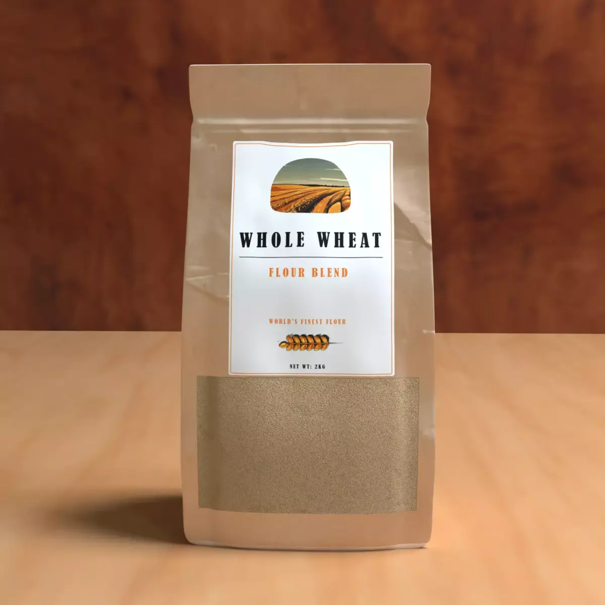 Whole Wheat Flour Blend: Get the goodness of whole grains with this whole wheat flour blend. The packaging is a rustic, brown paper bag with a clear window that showcases the product inside. The bag is adorned with a graphic of wheat fields and a wooden spoon, giving it a natural and wholesome feel. The label includes the text Whole Wheat Flour Blend in a handwritten font, adding a personal touch. Available in a 2kg size.