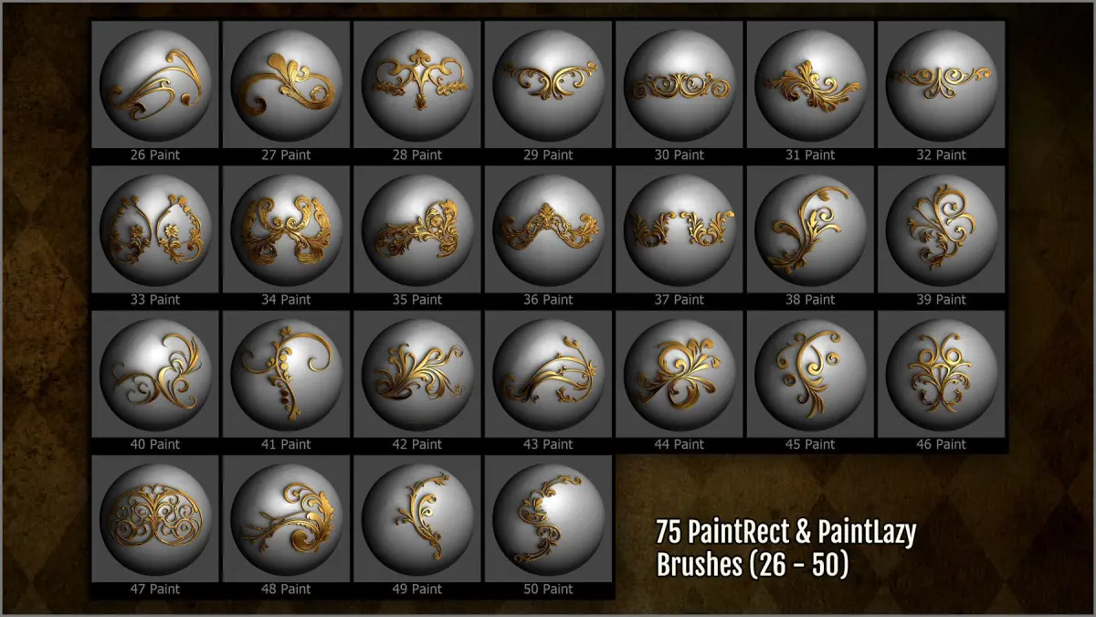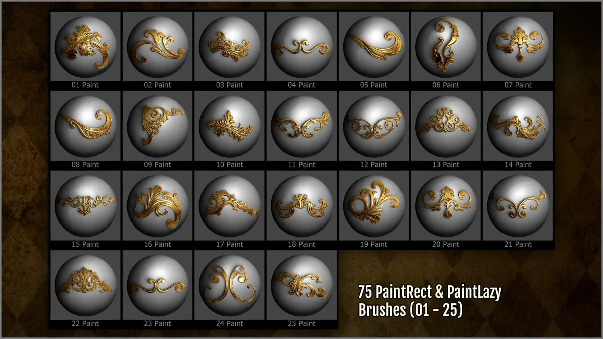- 300 ZBrush brushes: 75 DragRect, 75 Lazy, 75 PaintDrag, 75 PaintLazy.