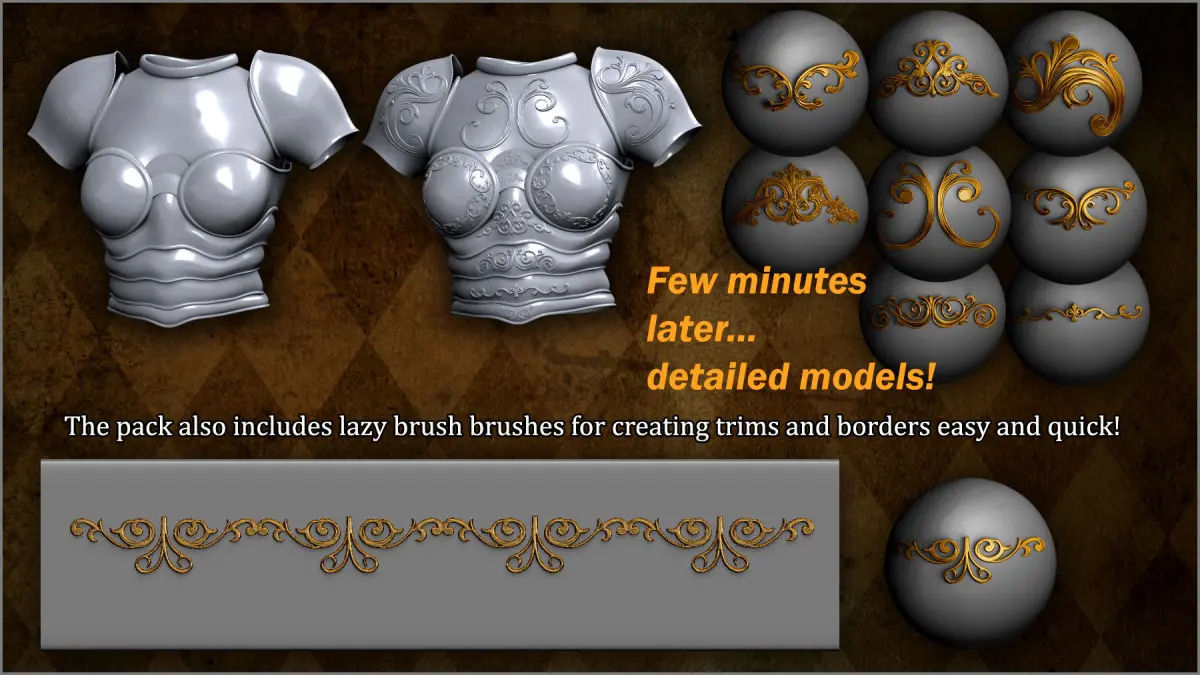 Flourish Maker is a set of 300 brushes and 75 alphas for adding ornaments to armors, shields, weapons, buildings, architecture, furniture, clothing, accessories, jewelry, frames, mirrors, and all kinds of 3D models, giving them a rich and detailed look in an instant. Good ornaments can take your models to an upper level. A must have for your creations inside ZBrush!