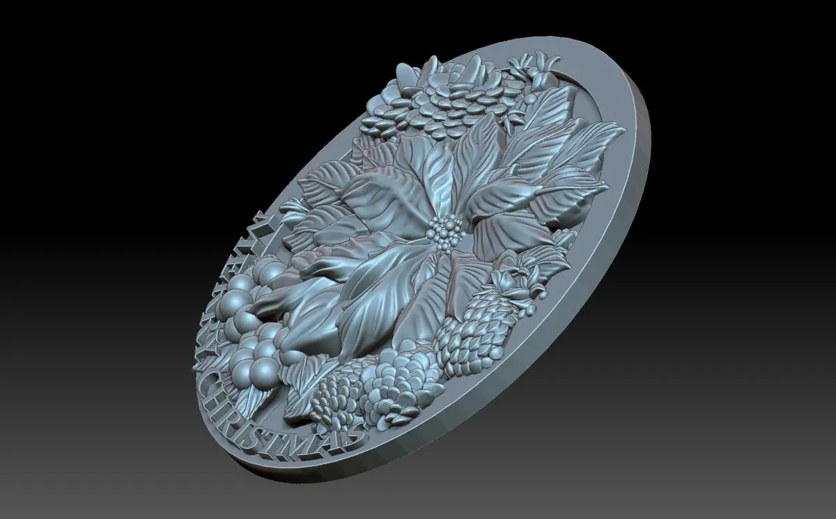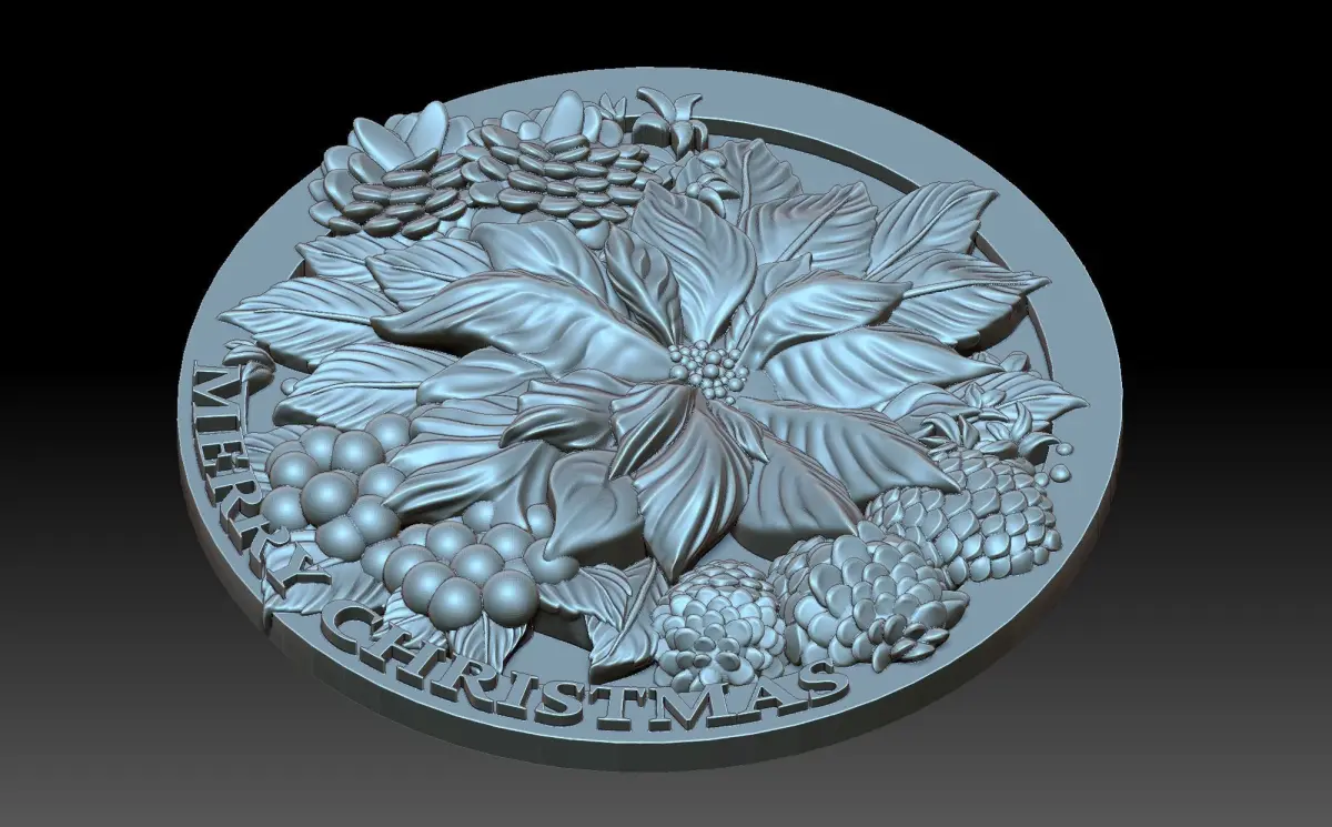 A 3D model of a bas-relief depicting a flower - a Christmas star. A traditional attribute of the Christmas celebration. There are also decorative elements of a plant theme on the panel. The work is suitable for 3D printing and CNC machine tools.