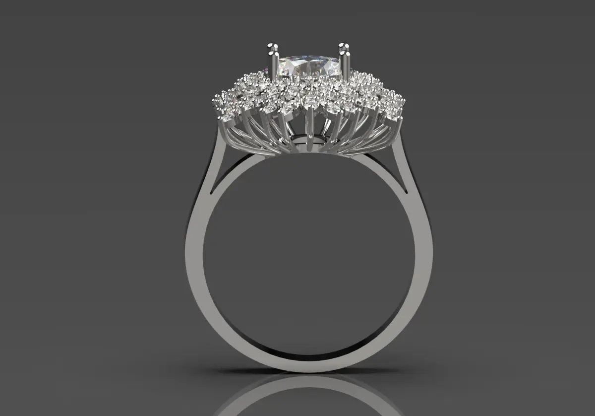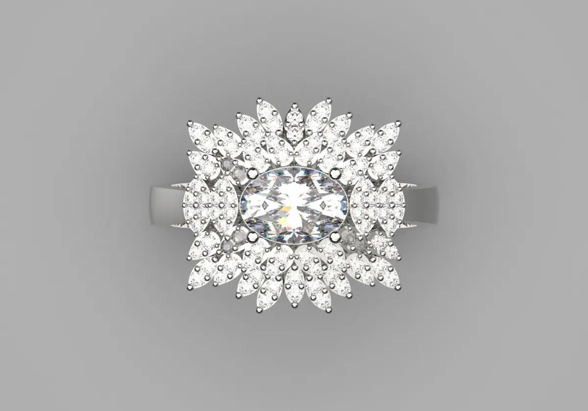 - Side Gems: The diamonds surrounding the center gem are designed in teardrop and round shapes, creating a look similar to sparkling flower petals.