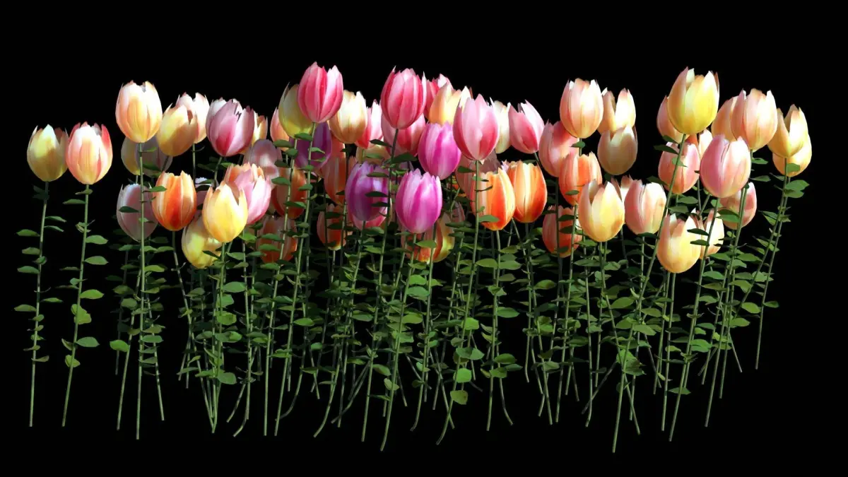 12 tulips (1 big asset that contains all of them, 3 Pink Tulips, 3 Orange Tulips, and 6 Yellow Tulips