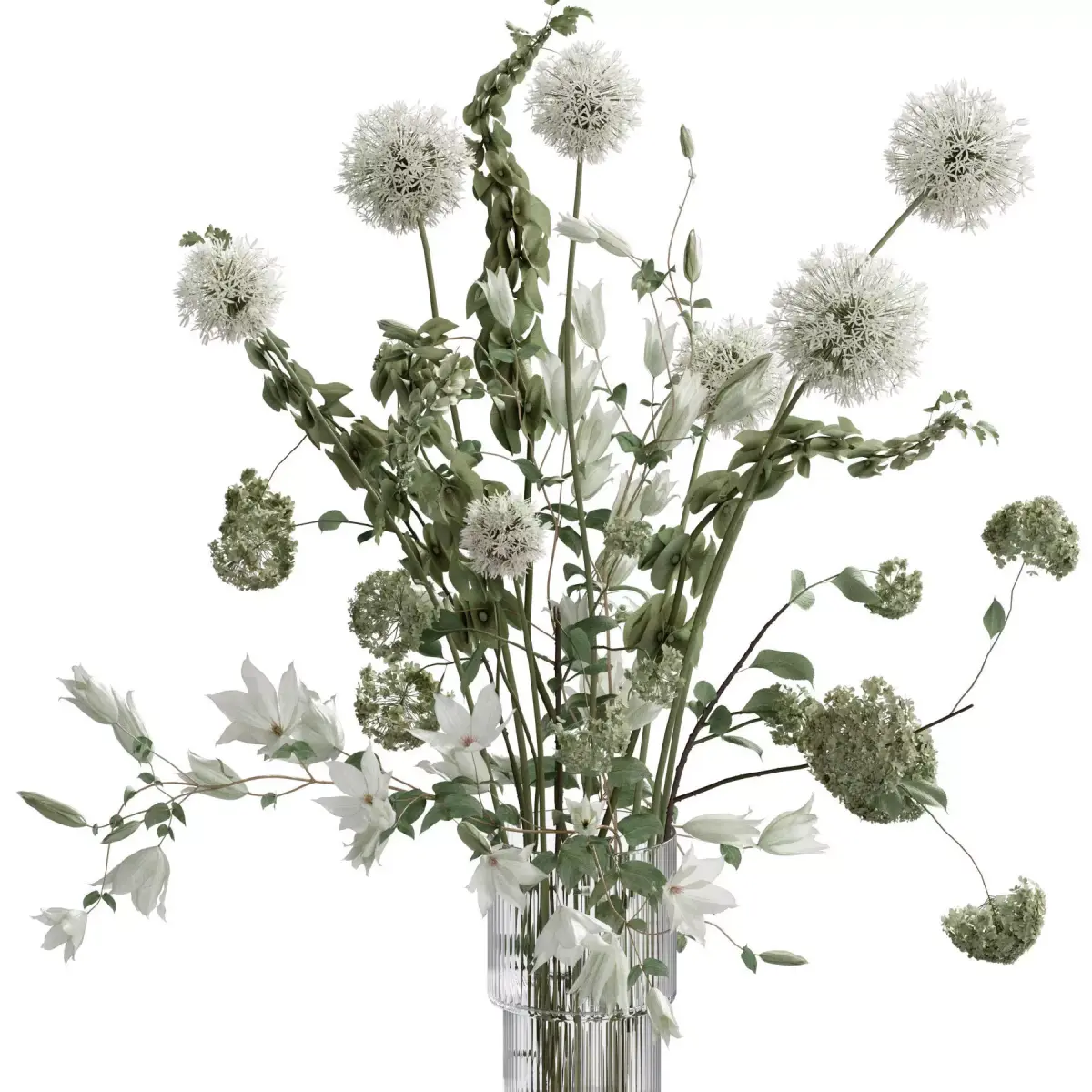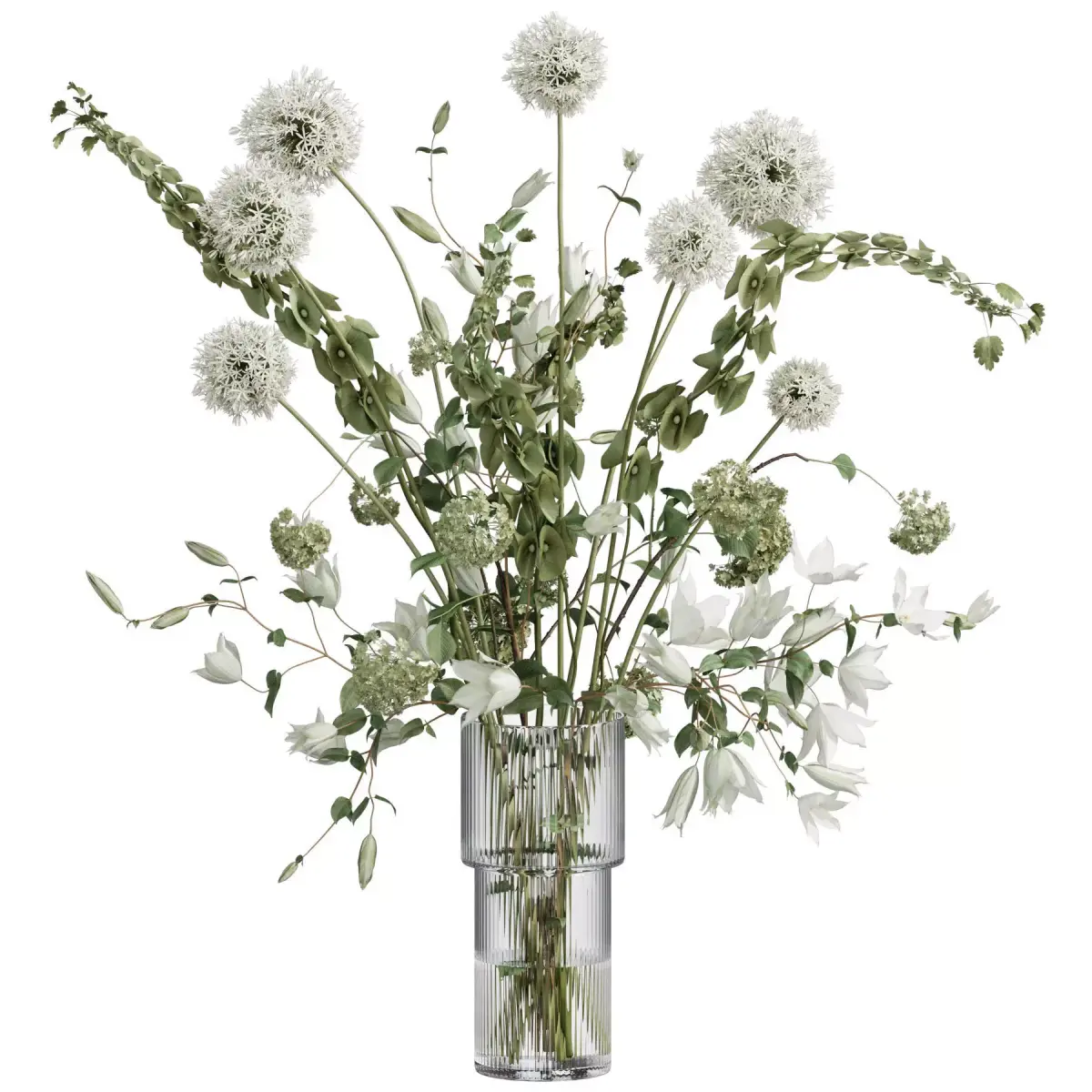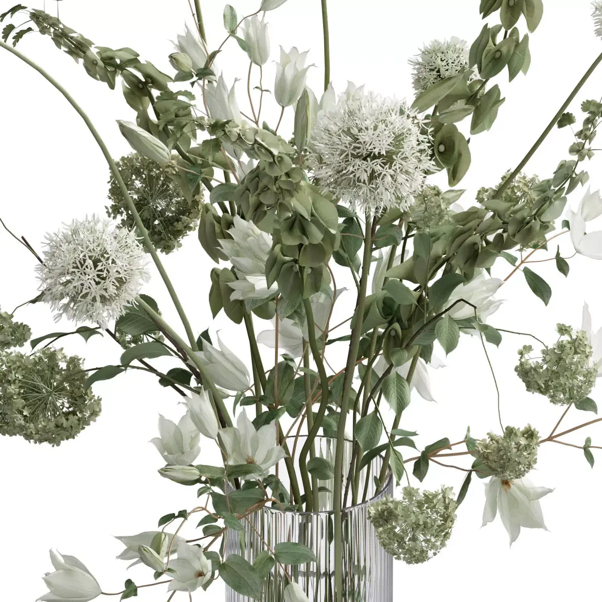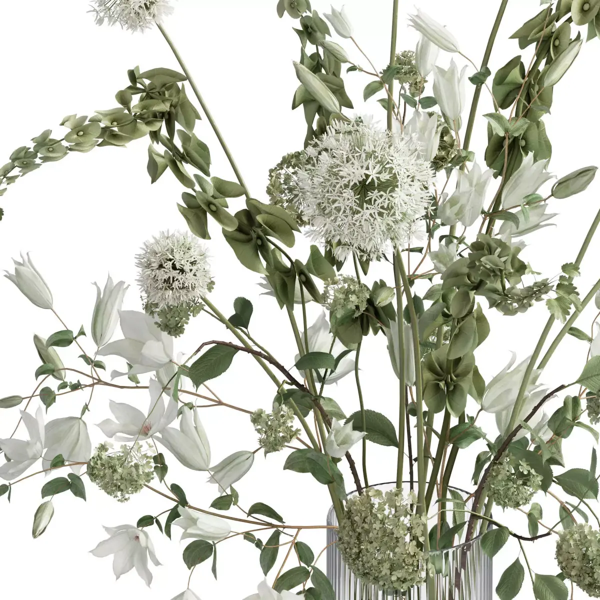 bouquet, plant, flower, flowers, indoor, decor, decorative, organic, vase, glass, inrerior, decoration, flora, allium, bells of ireland, bells, ireland, clematis, hydranegea, interior, decoration, flora, glass,